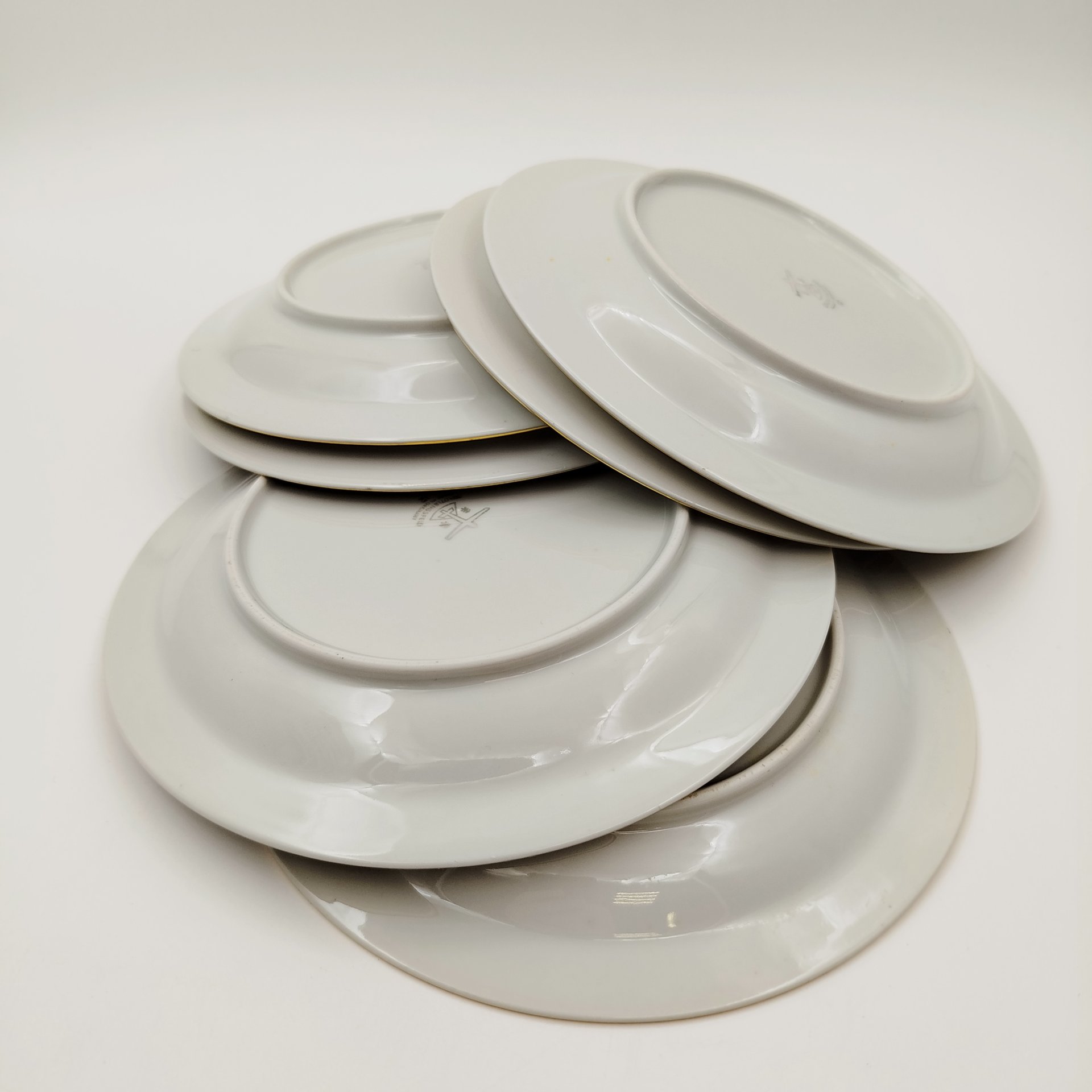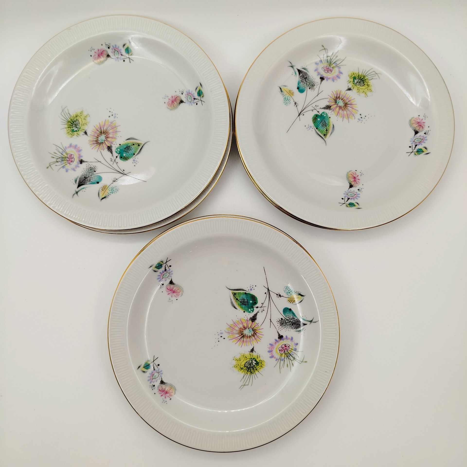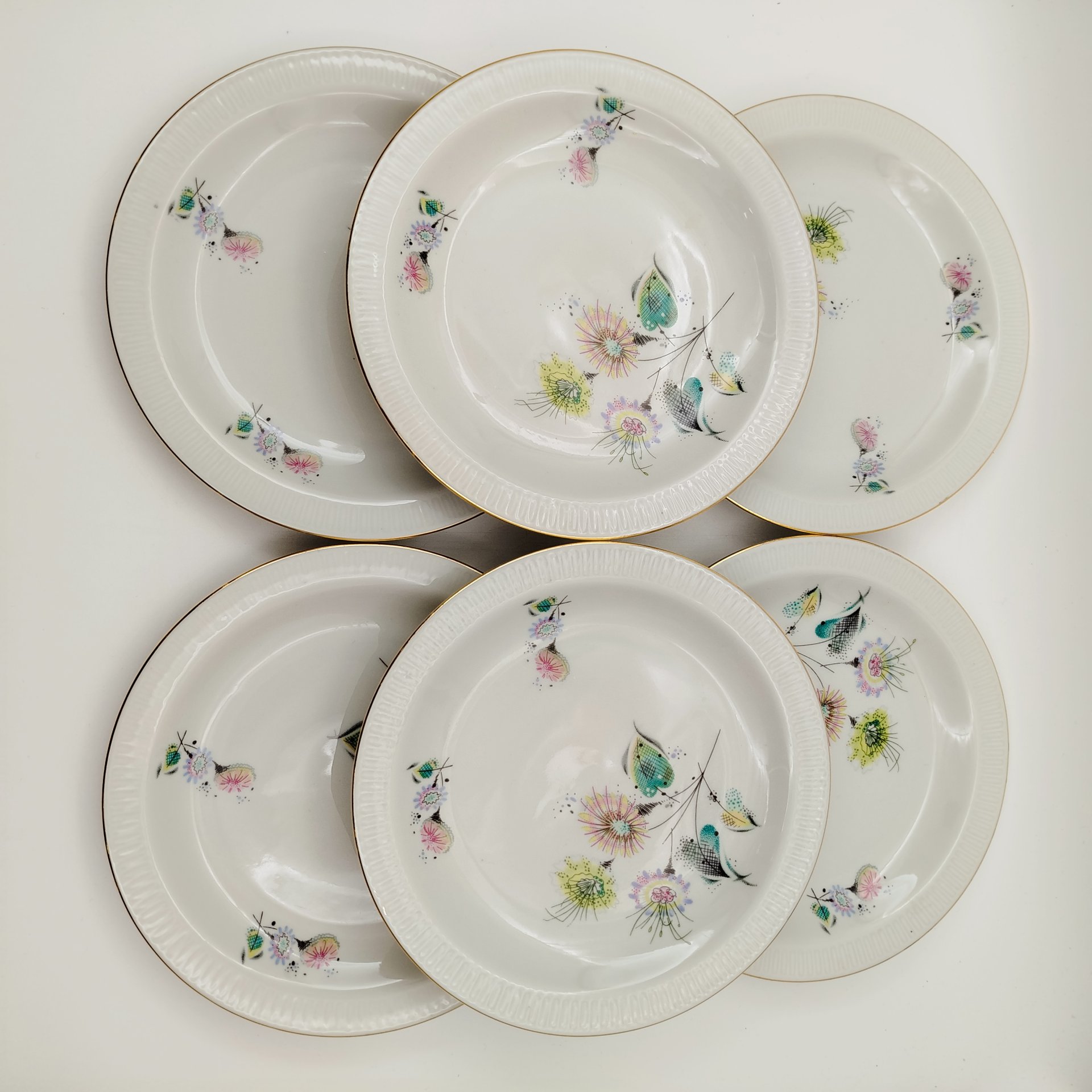 Набор из шести пирожковых тарелок с цветочным декором золотистого цвета, фарфор, деколь, золочение, Graf Von Henneberg Porzellan, 1777 Jlmenau, ГДР, 1973-1977 гг.