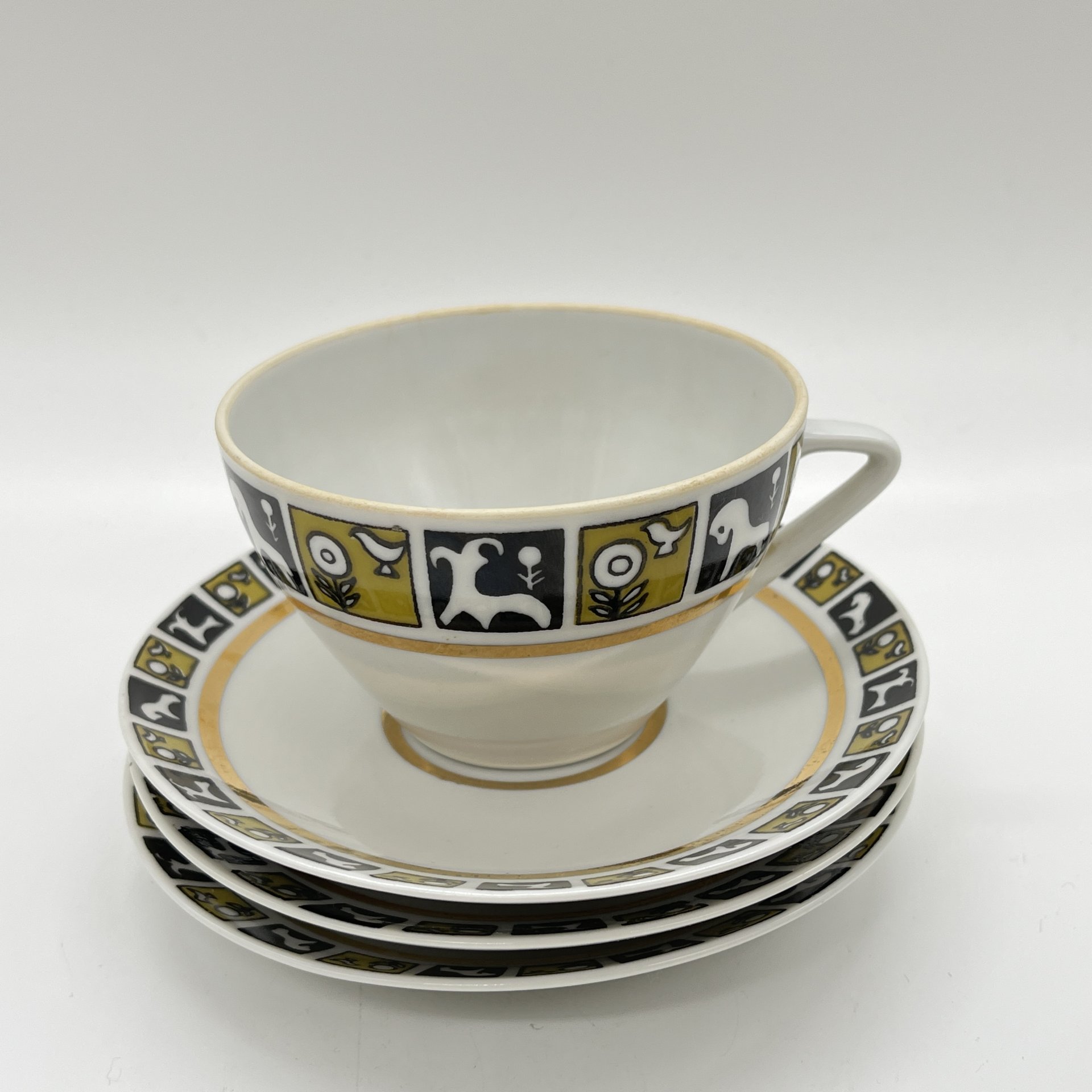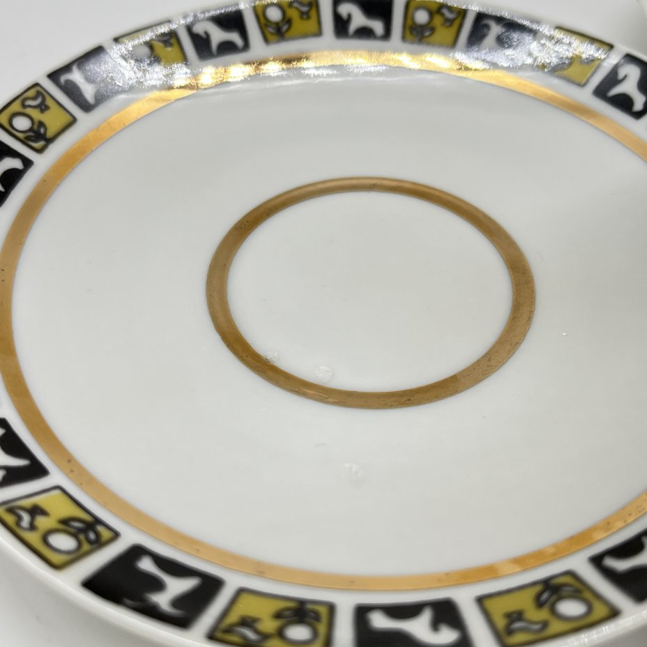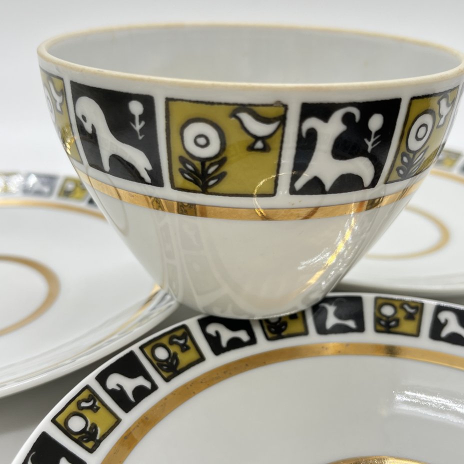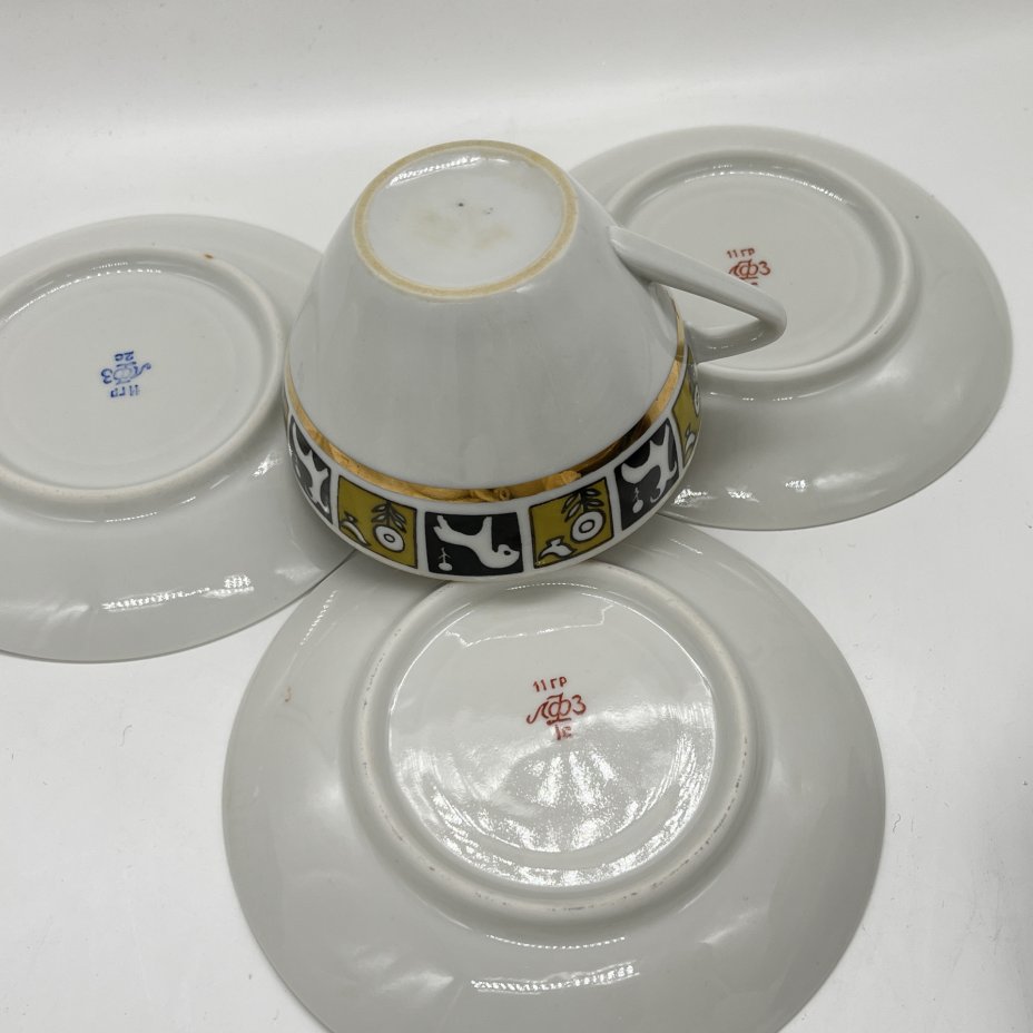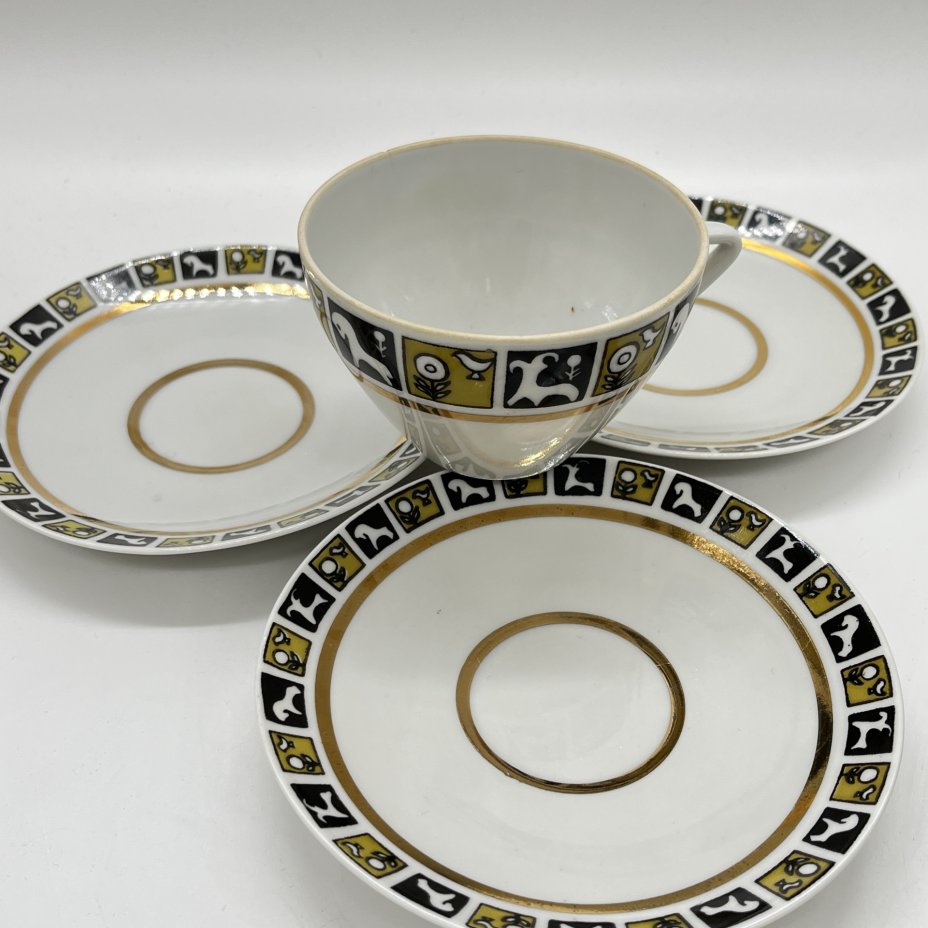 Чайное трио с геометрическим орнаментом, мануфактура WORKS GEHREN, фарфор, крытьё, золочение, ГДР, 1947-1969 гг.