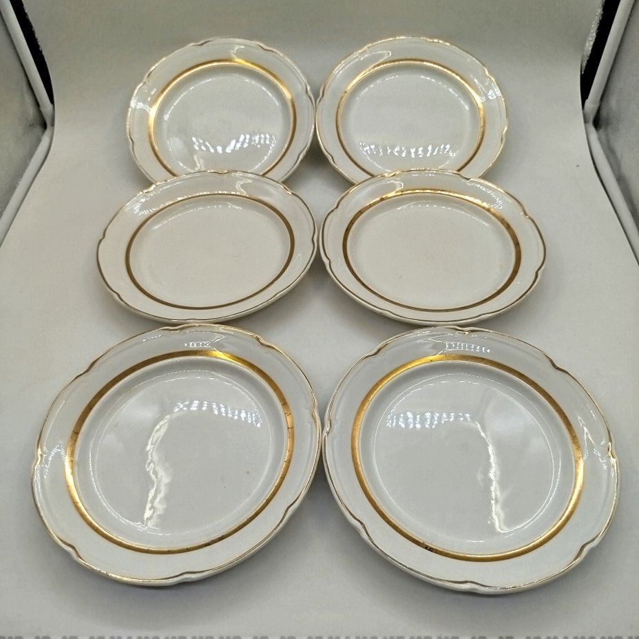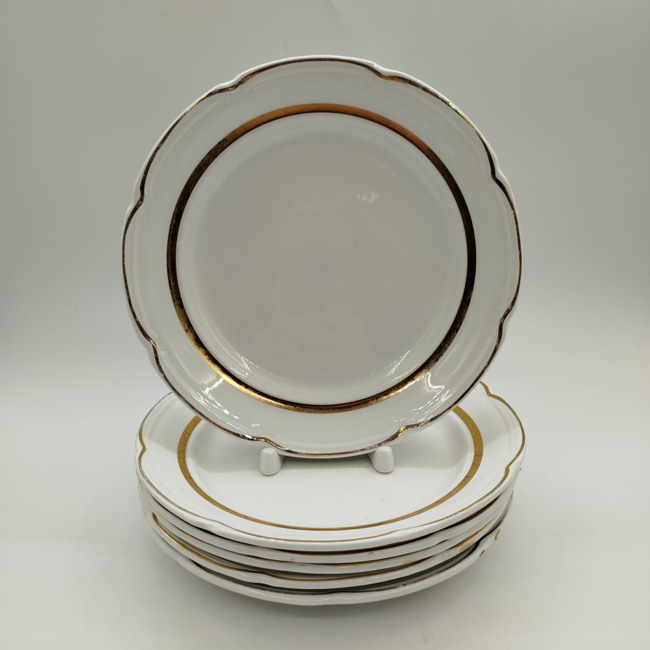 Набор из шести десертных тарелок, фаянс, золочение, Конаковский фаянсовый завод им. М.И. Калинина (ЗиК Конаково), СССР, 1974-1991 гг.