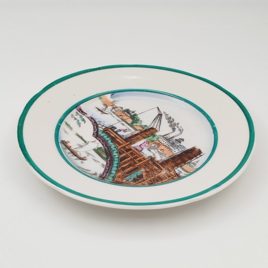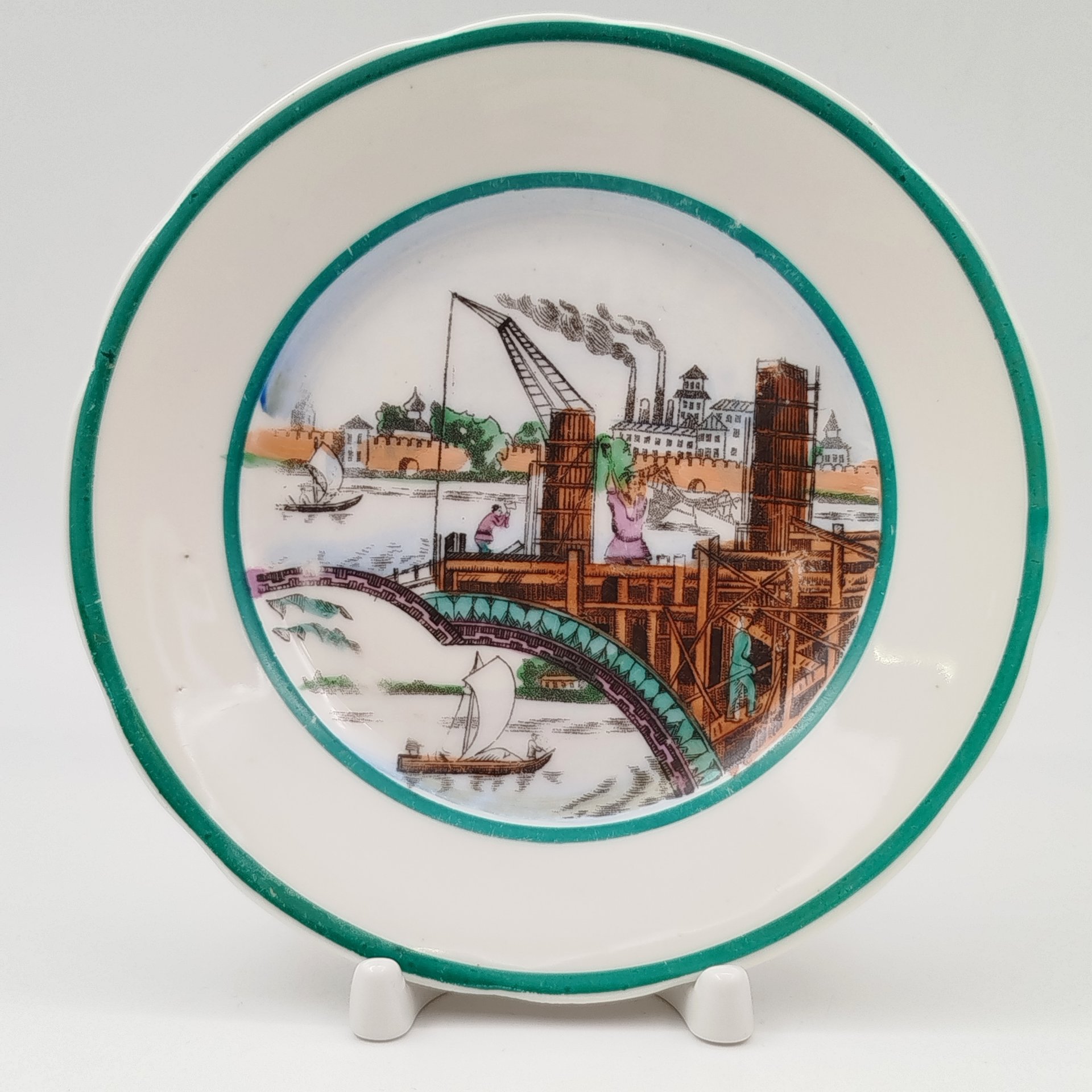 Тарелка из сервиза "Новгородская стройка" ("Волховстрой") автор Т.З. Подрябинников, фарфор, деколь, Фарфоровый завод «Пролетарий» (Бронница, Мста), СССР, 1945-1946 гг.