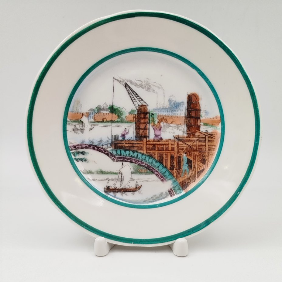 Тарелка из сервиза "Новгородская стройка" ("Волховстрой") автор Т.З. Подрябинников, фарфор, деколь, Фарфоровый завод «Пролетарий» (Бронница, Мста), СССР, 1945-1946 гг.