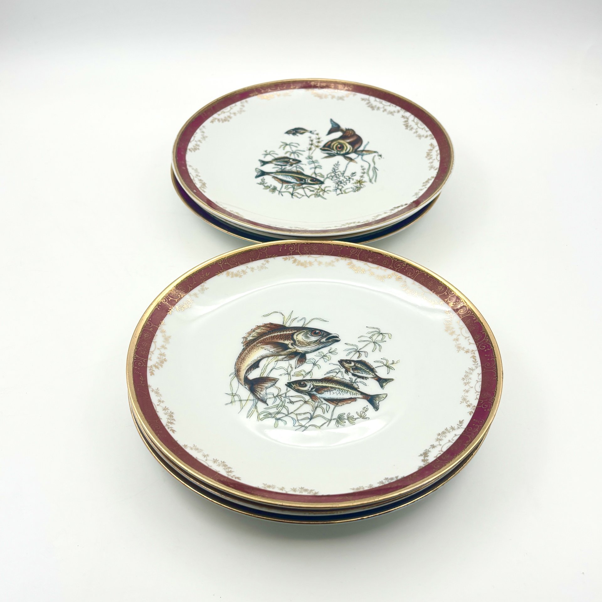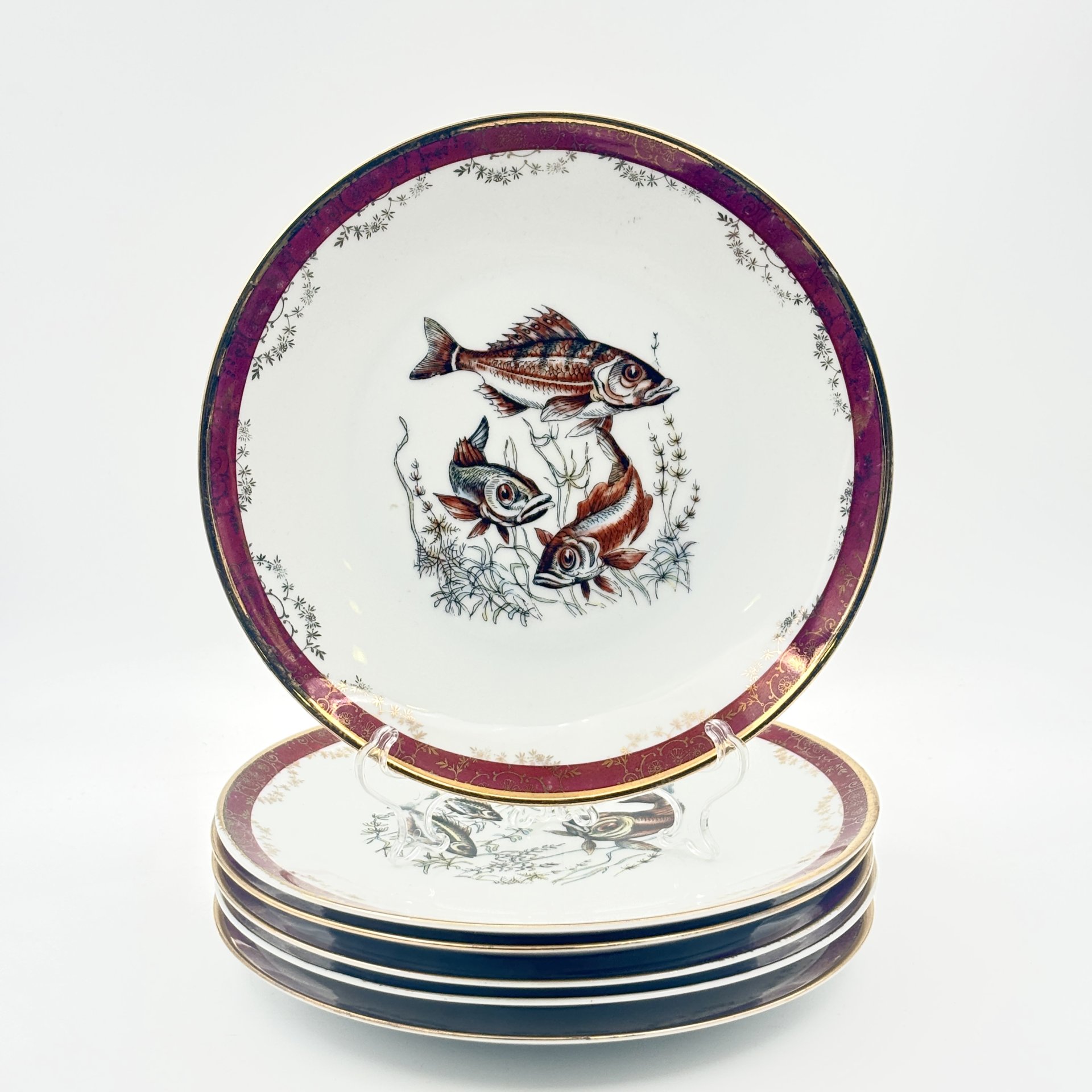 Набор десертных тарелок с кобальтовым кантом и золотистым растительным декором на 5 персон, фарфор, крытье, золочение, Дмитровский фарфоровый завод (ДФЗ Вербилки), СССР, 1954-1965 гг.