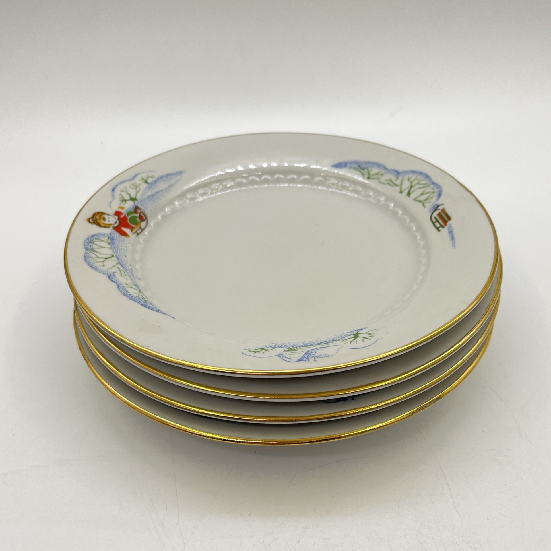 4 десертные тарелки из набора детской посуды "Зимние забавы", автор формы В. Г. Спица, фарфор, деколь, золочение, Тернопольский фарфоровый завод, СССР, 1970-1990 гг.