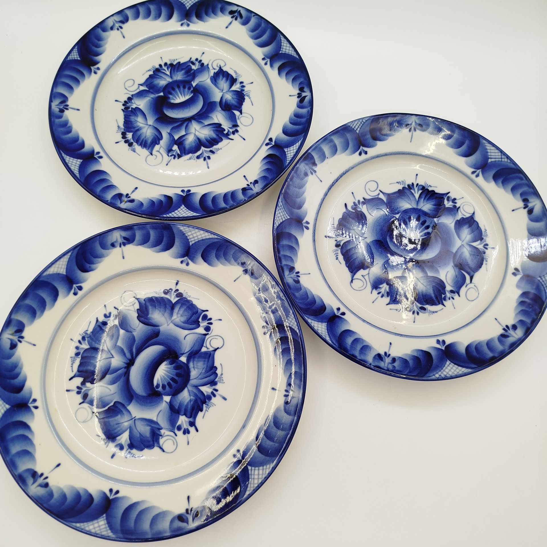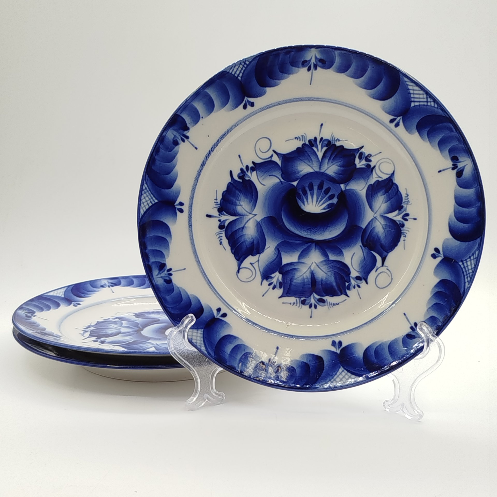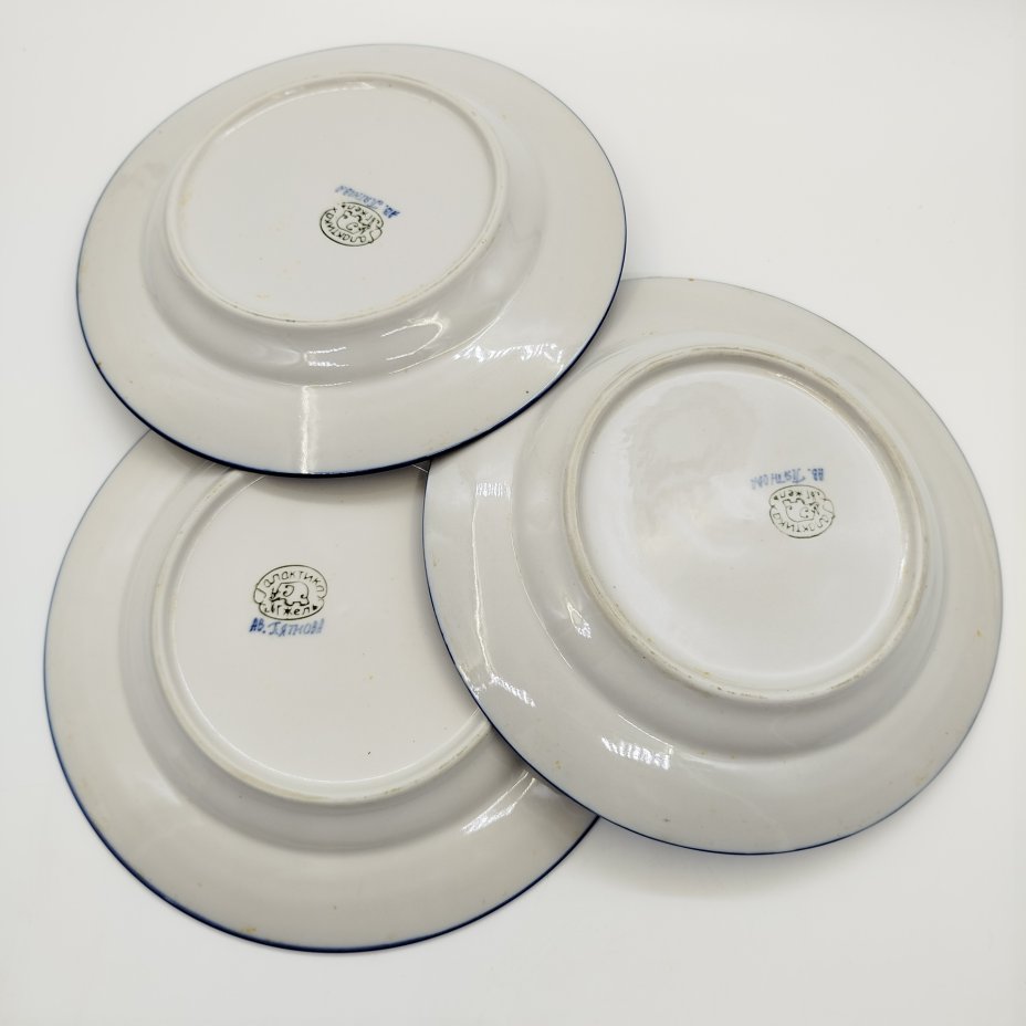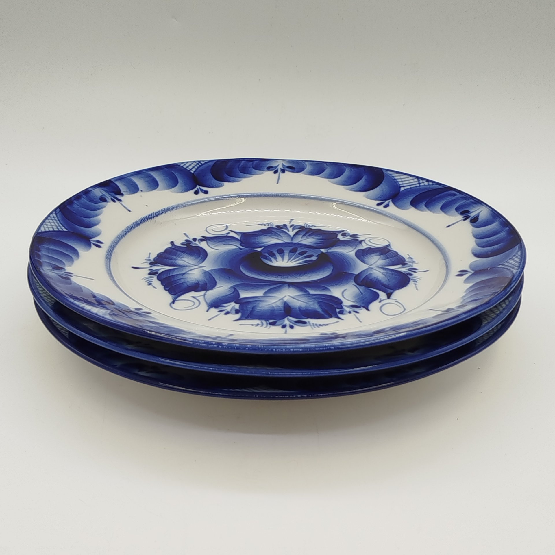 Набор из 3-х обеденных тарелок с цветочным декором, ав. Пятнова, фарфор, роспись, Гжельская фарфоровая мануфактура «Галактика», Российская Федерация, 1991-2015 гг.