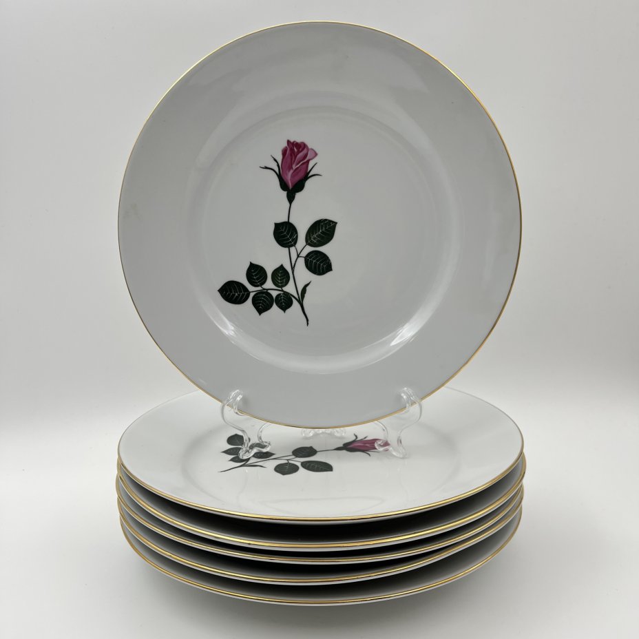 Набор из 6-ти обеденных тарелок с изображением розы, фарфор, деколь, золочение, Kahla, ГДР, 1968-1987 гг.