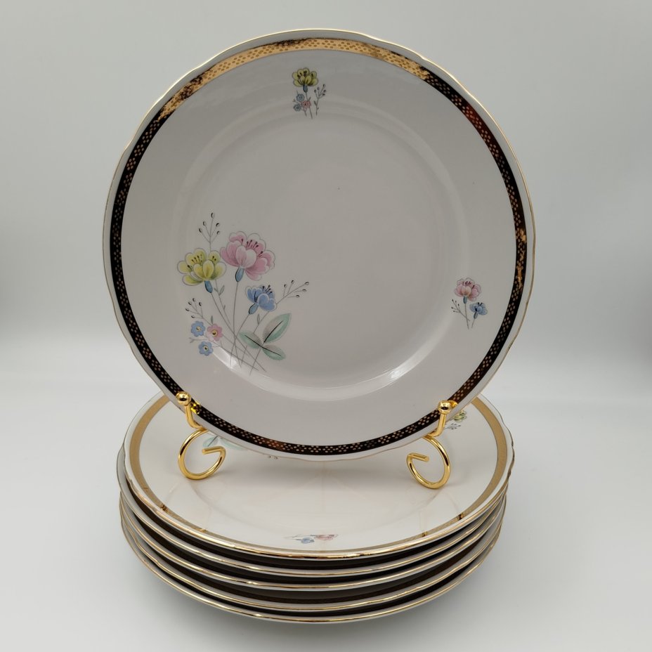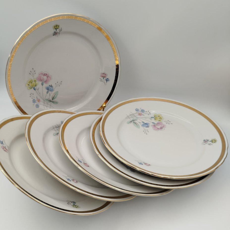 Набор из шести обеденных тарелок с цветочным декором, фарфор, деколь, золочение, Chodziez, Польша, 1964-1990 гг.