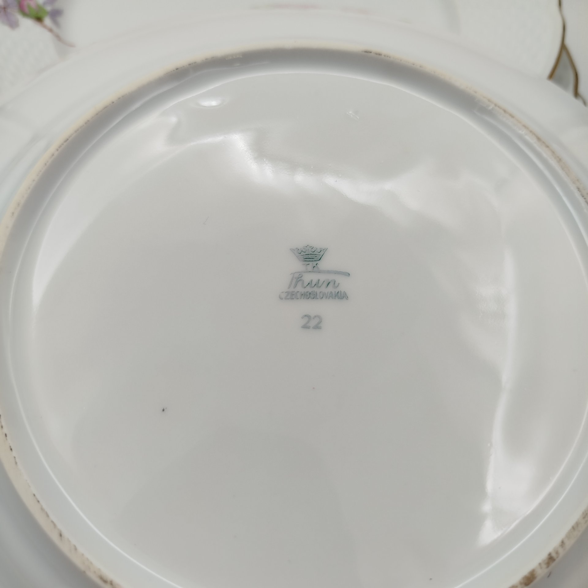 Пара обеденных тарелок с цветочным декором и фигурным краем, фаянс, деколь, золочение, Песоченская фабрика Брянской губернии, СССР, 1924-1930 гг.
