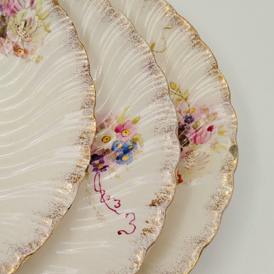 Набор из трёх обеденных тарелок с цветочным декором и рельефным бортом, фарфор, деколь, Российская империя, 1890-1915 гг.