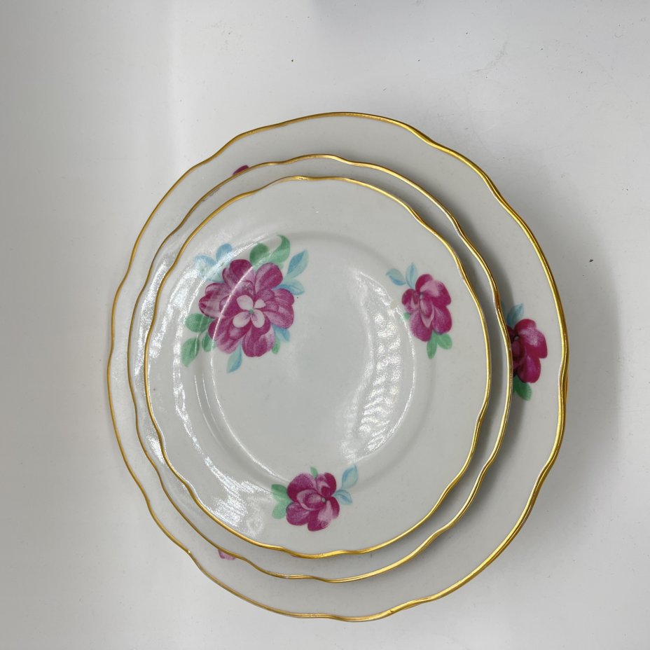 Набор из 3 тарелок с декором "Роза", фарфор, деколь, золочение, Дулевский фарфоровый завод (Дулёво), СССР, 1970-1980 гг.