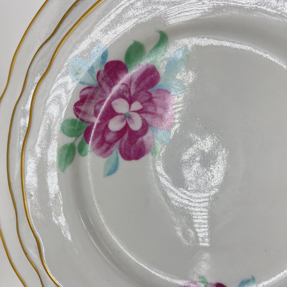 Набор из шести обеденных тарелок с цветочным декором, фарфор, деколь, золочение, Государственная Волховская фарфорово-фаянсовая фабрика «Коминтерн», СССР, 1934-1941 гг.
