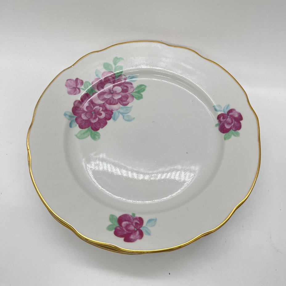 Набор обеденных тарелок, украшенных розовыми цветами и золотистыми листьями (4 шт.), фарфор, роспись, золочение, Фарфоровый завод «Пролетарий» (Бронница, Мста), СССР, 1956 г.