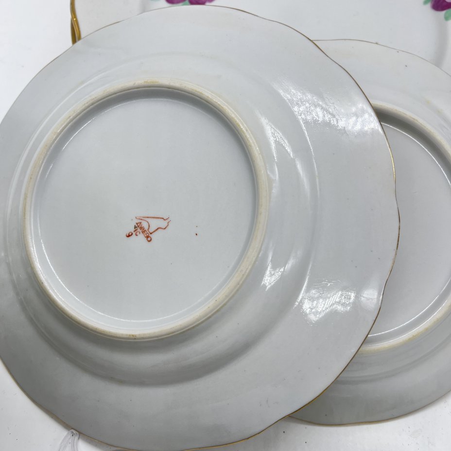 Набор из 3-х обеденных тарелок, украшенных изображениями яблонь, фарфор, деколь, золочение, Товарищество М.С. Кузнецова в Вербилках (г. Дмитров), Российская империя, 1890-1917 гг.
