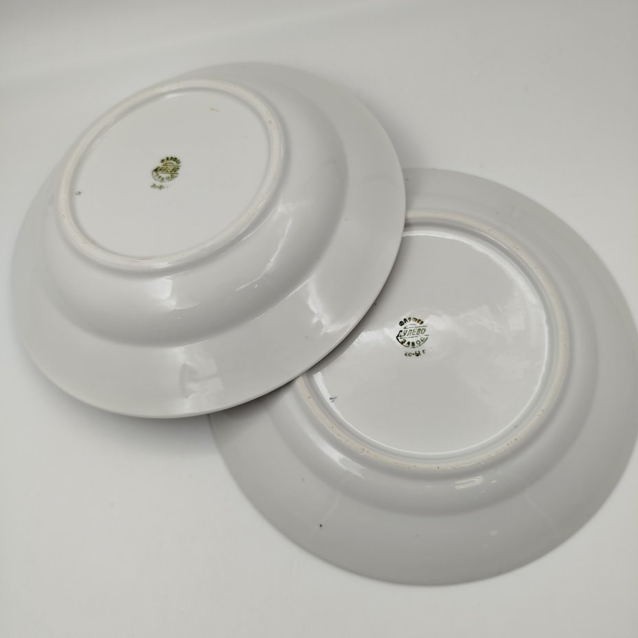 Пара обеденных тарелок, украшенных орнаментальным декором, фарфор, крытье кобальтом, золочение, Дулевский фарфоровый завод (Дулёво), СССР, 1937-1947 гг.