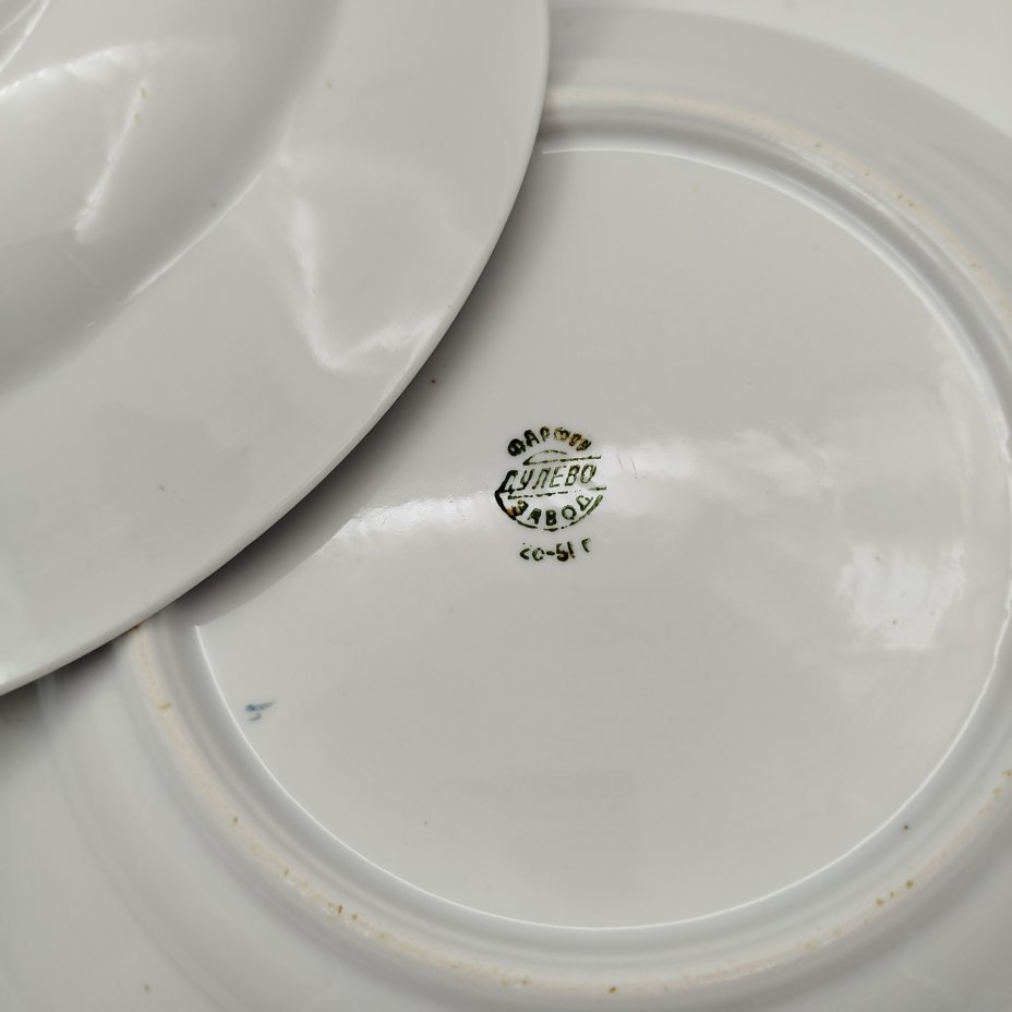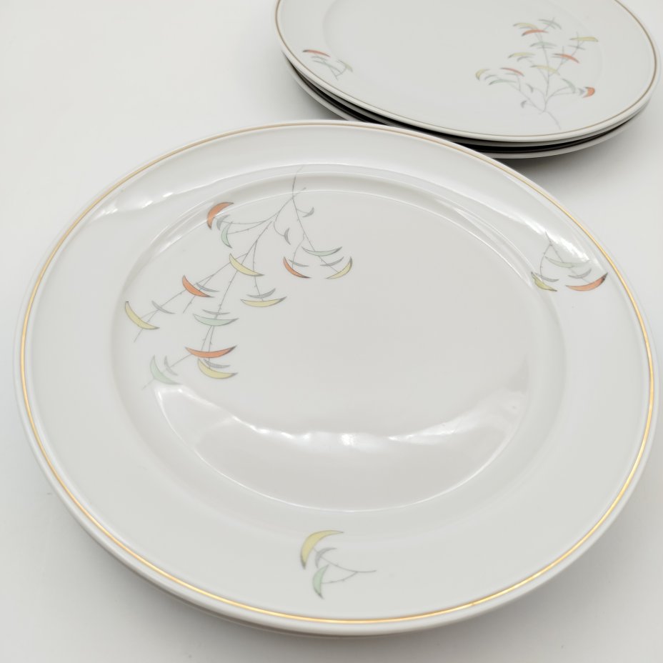 Набор из четырех обеденных тарелок из сервиза «Озерный», фарфор, крытье, деколь, золочение, Фарфоровый завод «Пролетарий» (Бронница, Мста), СССР, 1930-1945 гг.