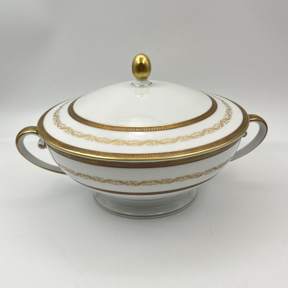 Набор из блюда, террины (без крышки) с зеленым кантом, фаянс, крытье, золочение, Товарищество М.С. Кузнецова, Российская империя, 1890-1917 гг.