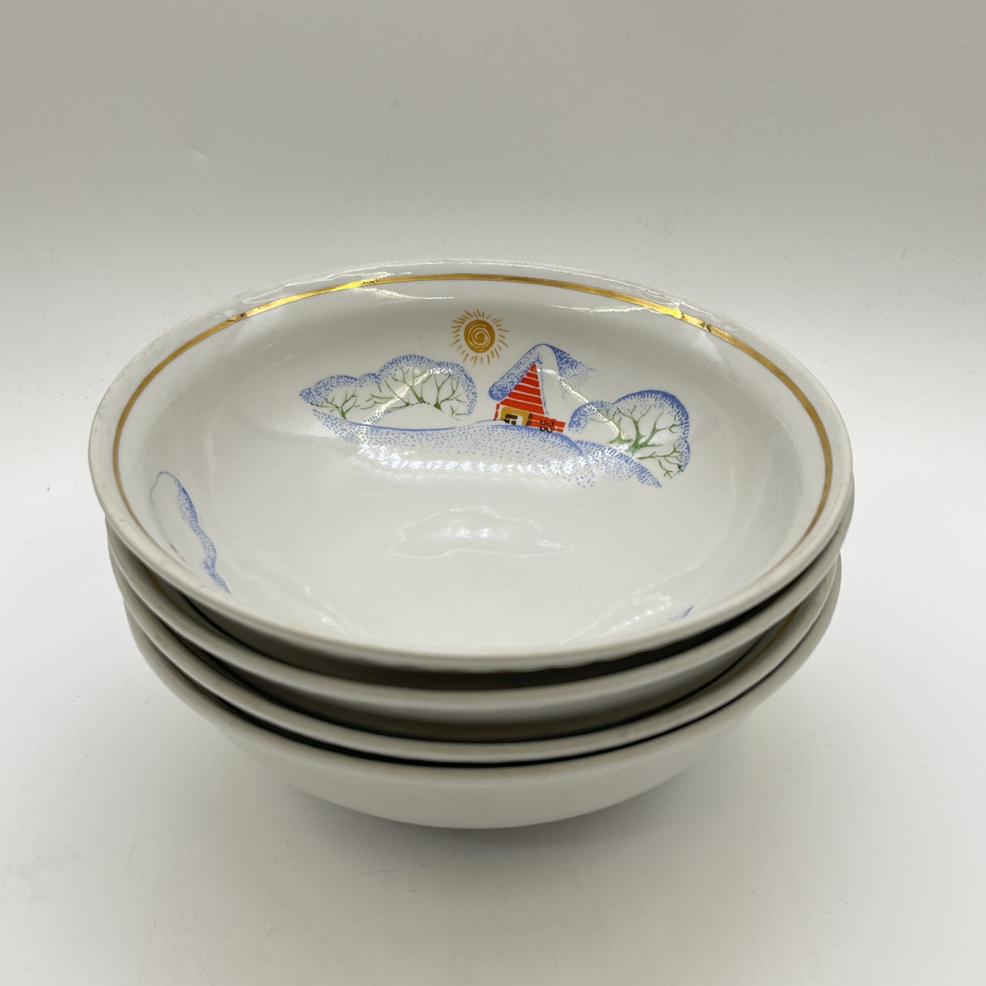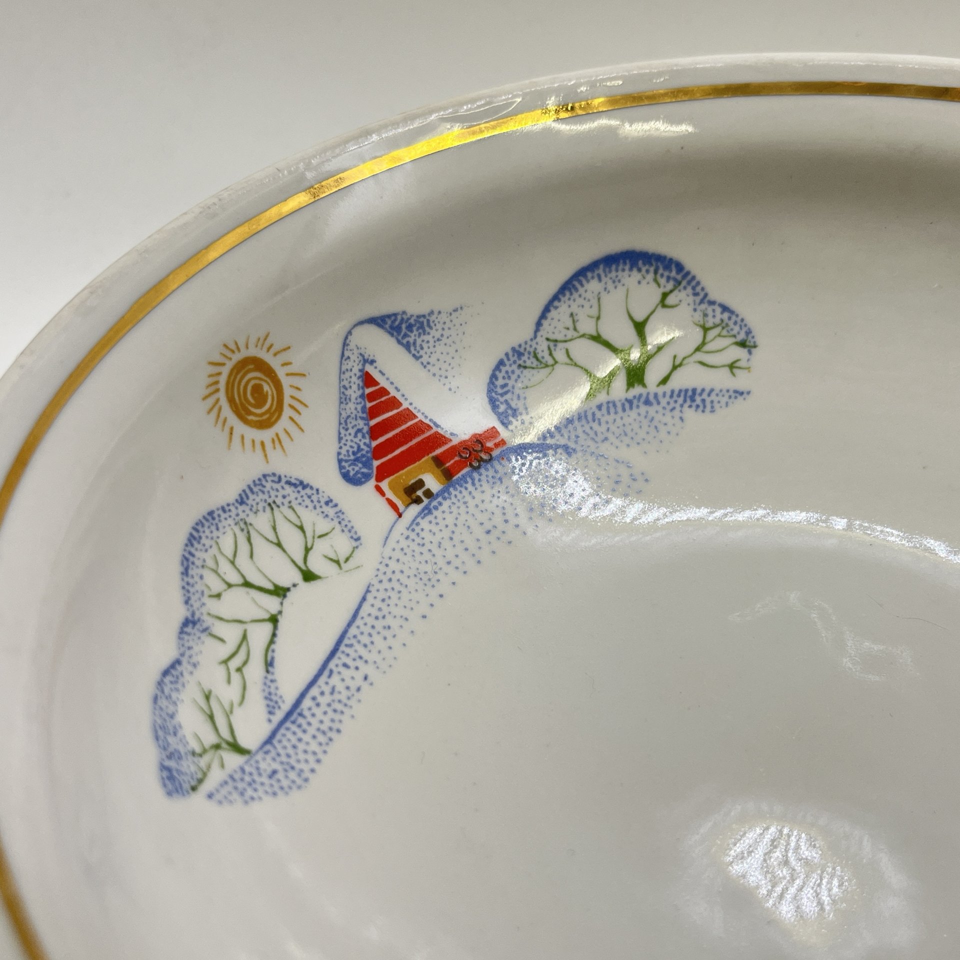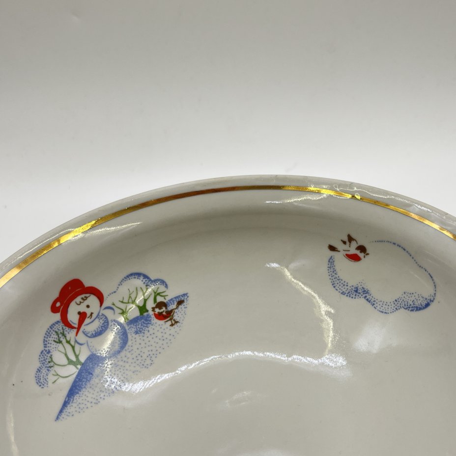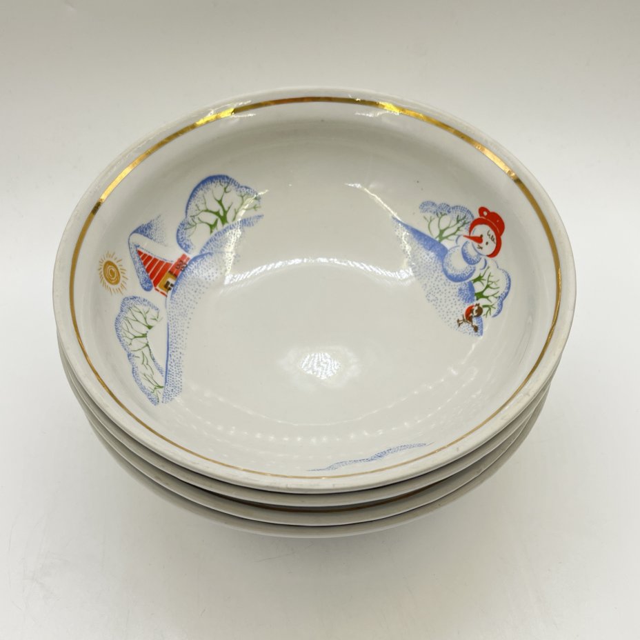 4 суповые тарелки из набора детской посуды "Зимние забавы", автор формы В. Г. Спица, фарфор, деколь, золочение, Тернопольский фарфоровый завод, СССР, 1970-1990 гг.