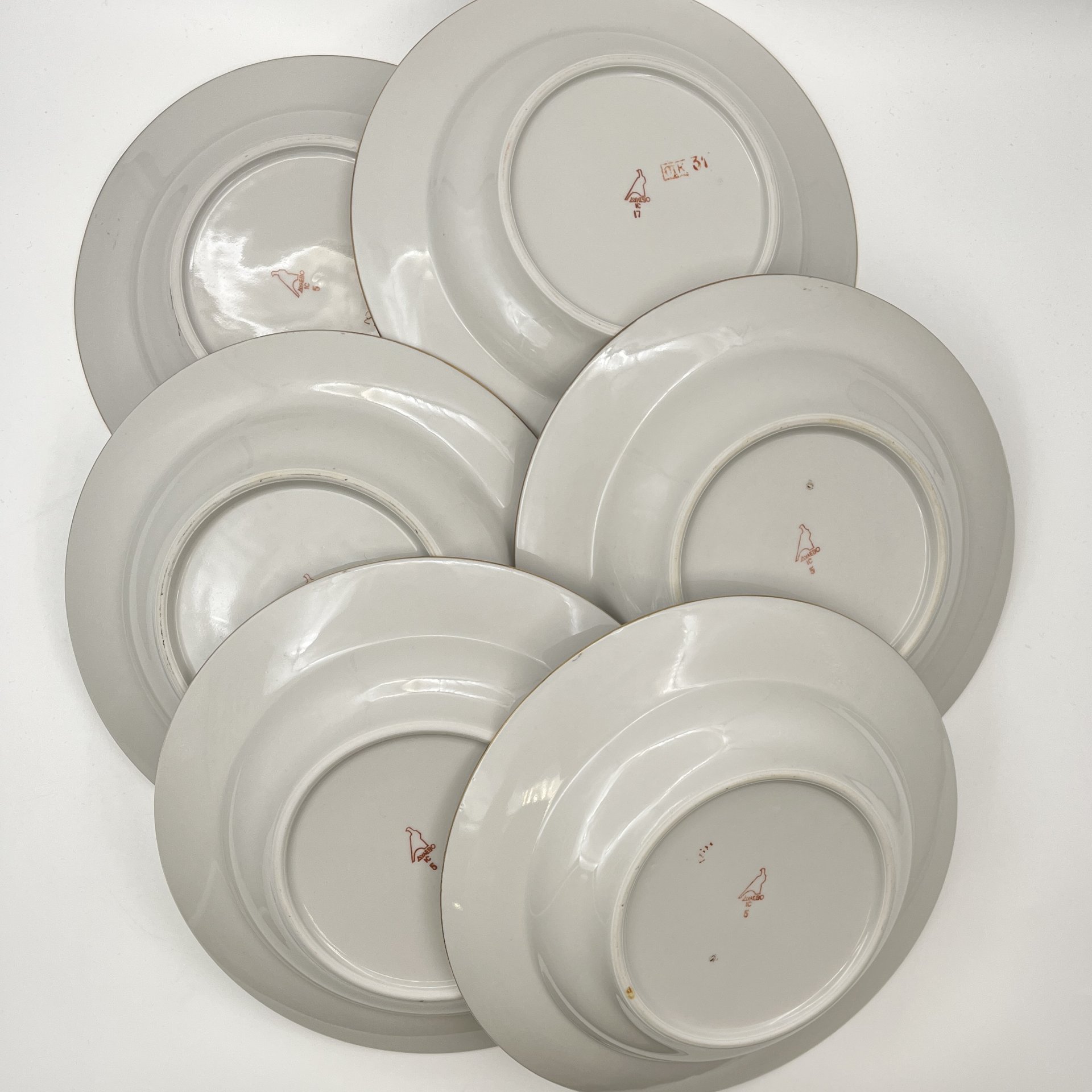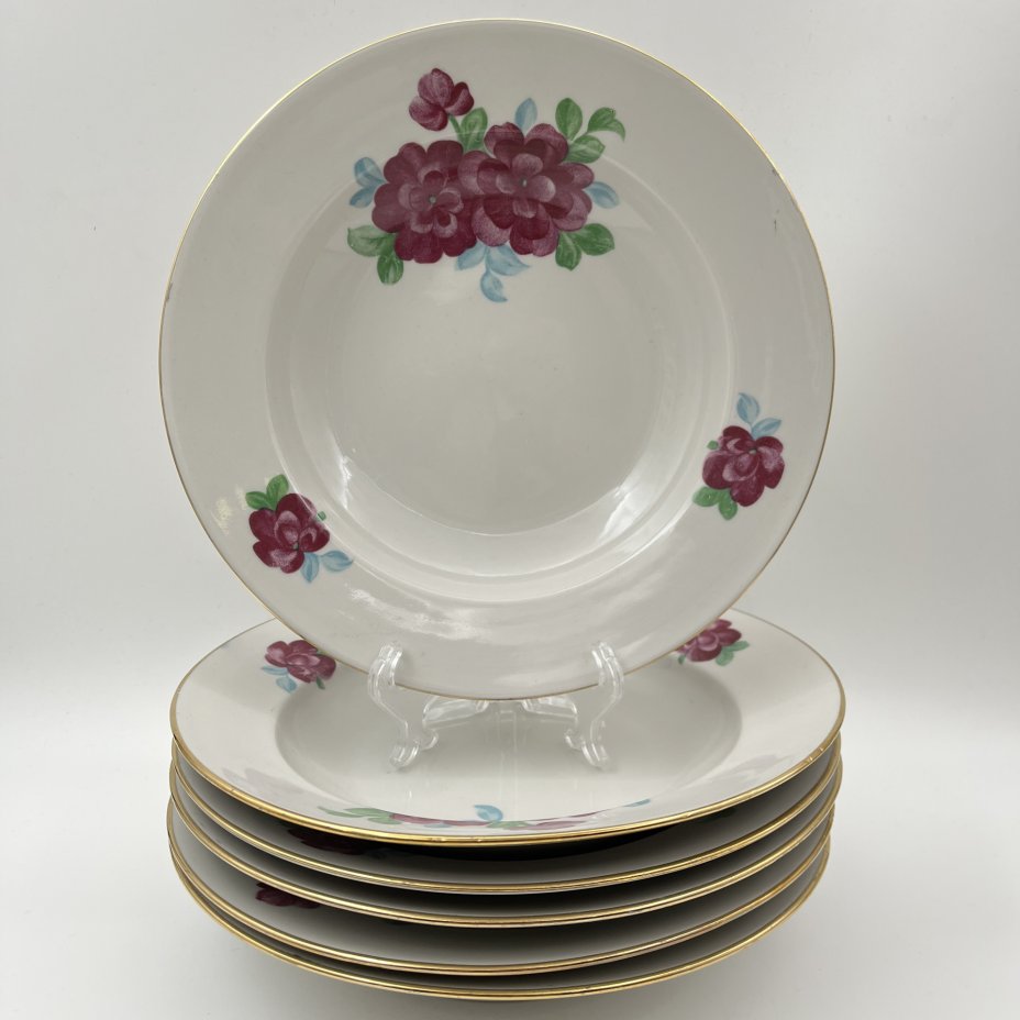 Комплект из 6-ти суповых тарелок, украшенных цветочным декором, фарфор, деколь, золочение, Дулевский фарфоровый завод (Дулёво), СССР, 1954 г.