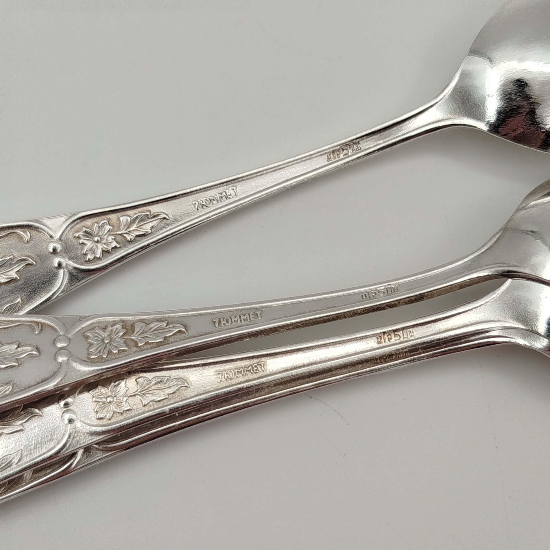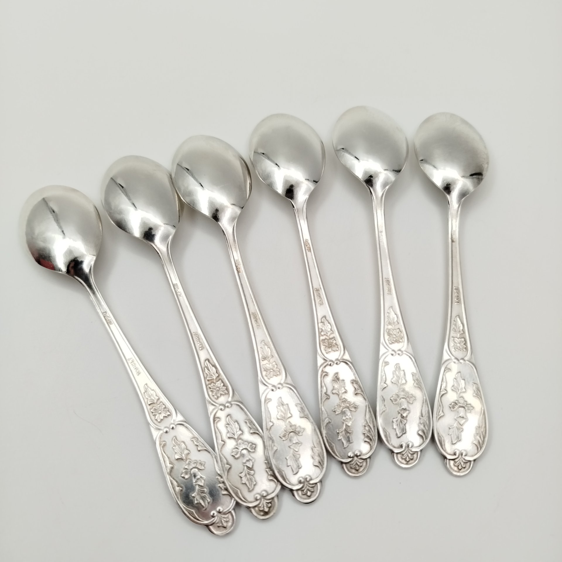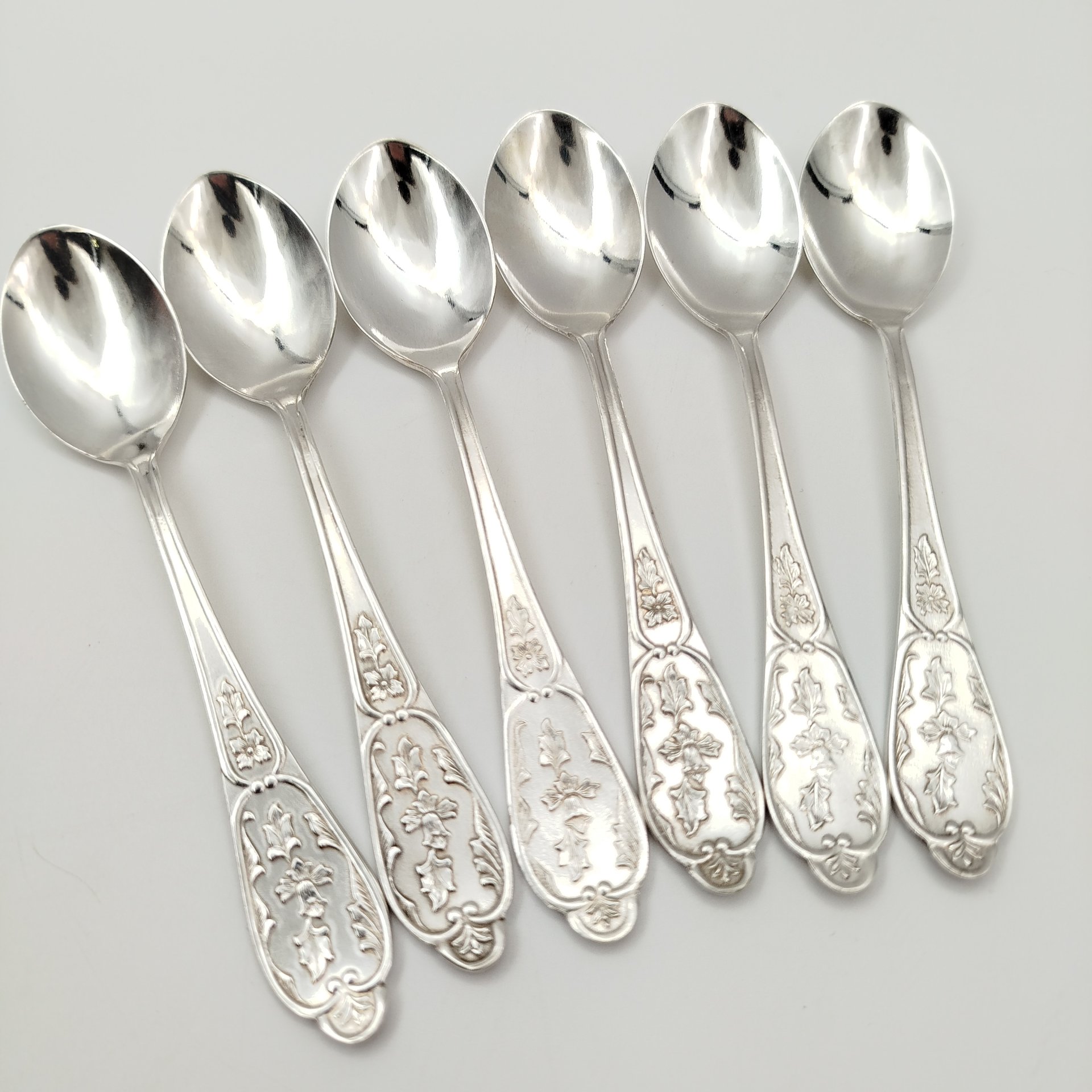 Набор чайных ложек на 6 персон с растительным декором, в подарочной коробке, мНЦ (медь-никель-цинк), картон, ткань, Завод «Мстерский ювелир», СССР, 1977 г.