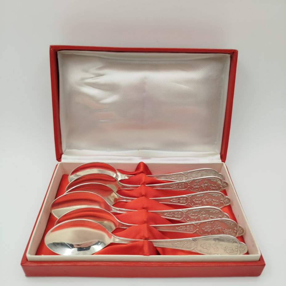 Купить Набор чайных ложек на 6 персон с растительным декором, в подарочной коробке, мНЦ (медь-никель-цинк), картон, ткань, Завод «Мстерский ювелир», СССР, 1977 г.