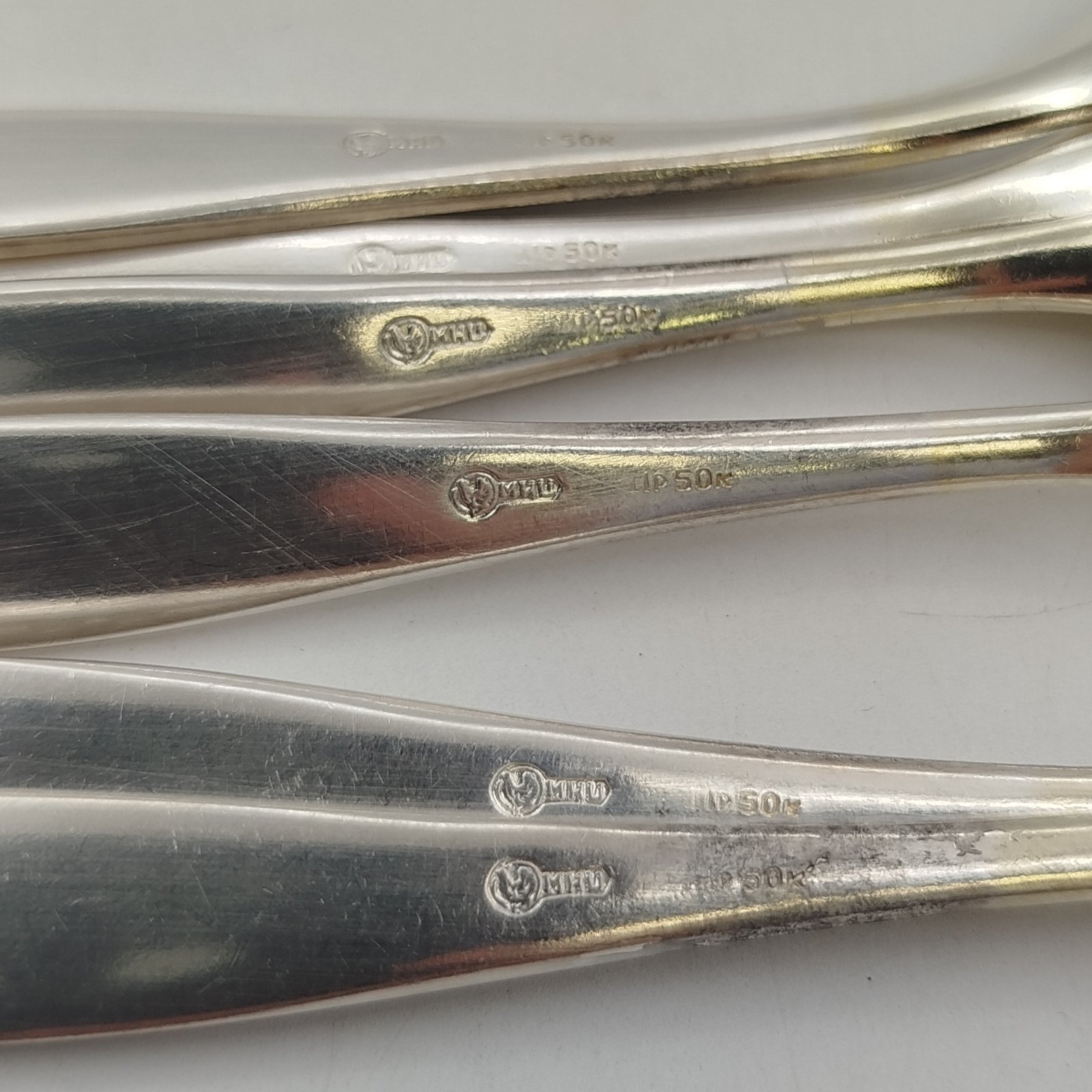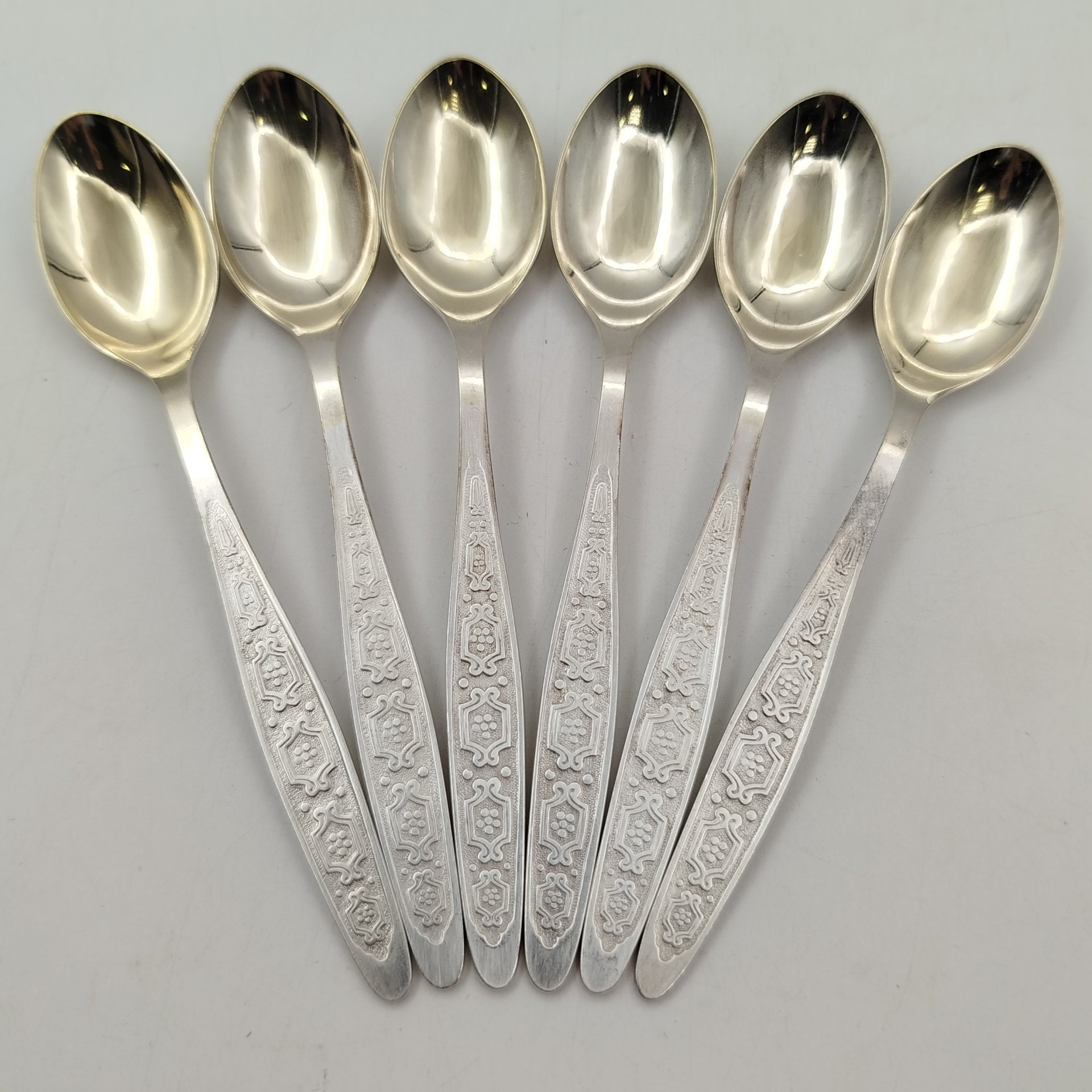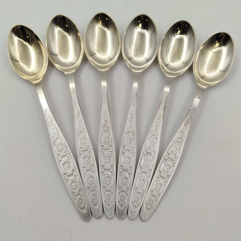 Набор из шести чайных ложек с декором в виде завитков на черенках, мельхиор (медь-никель), золочение, Артель «Красносельский ювелир», СССР, 1970-1990 гг.