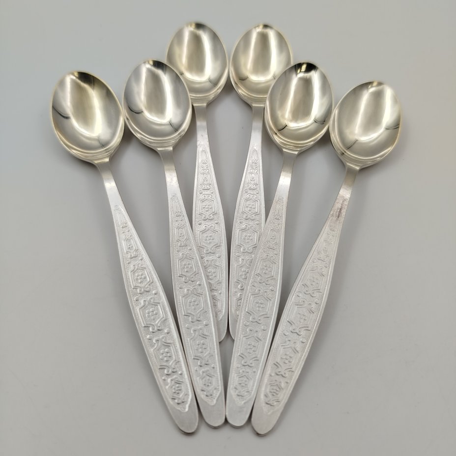 Набор из шести чайных ложек с декором в виде завитков на черенках, мельхиор (медь-никель), золочение, Артель «Красносельский ювелир», СССР, 1970-1990 гг.