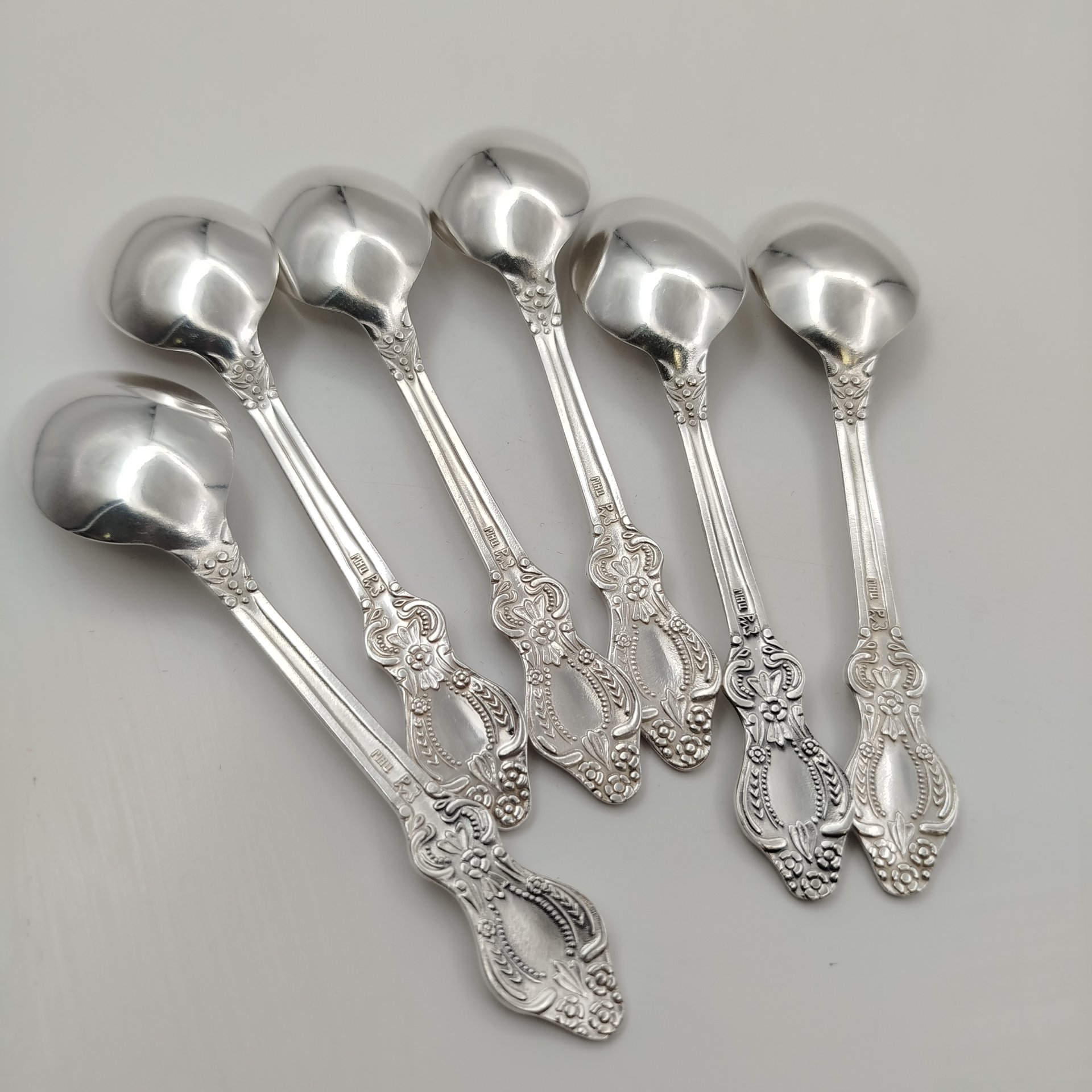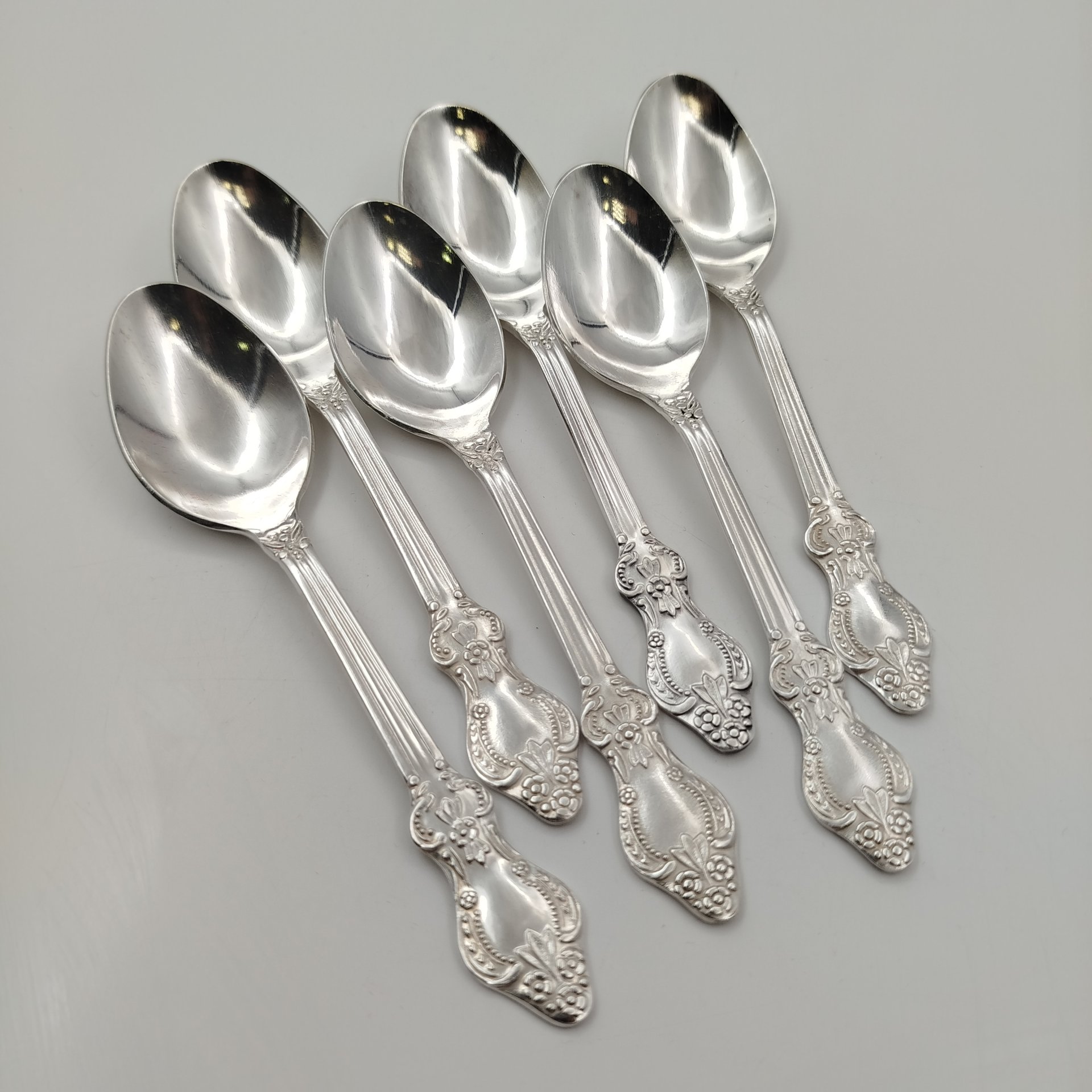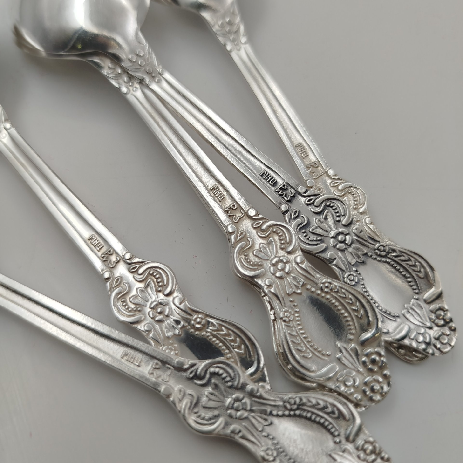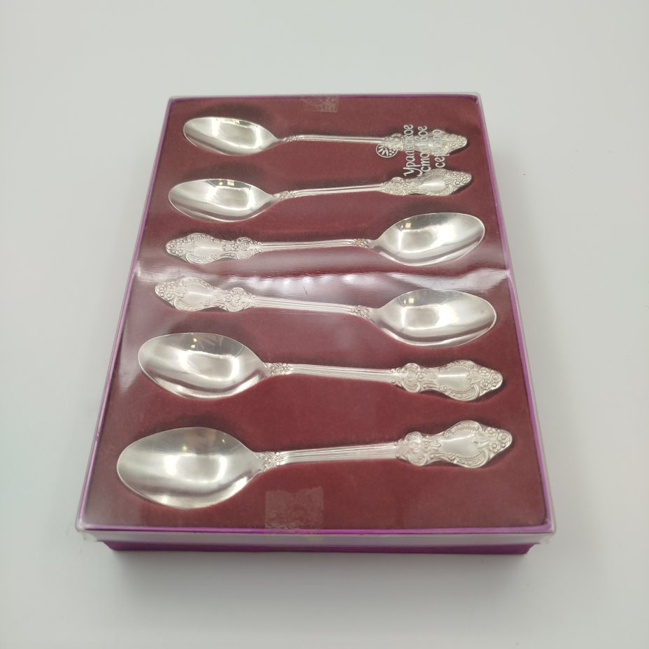 Набор из 6-ти чайных ложек с растительным декором в подарочной упаковке, мНЦ (медь-никель-цинк), картон, Режевский механический завод (РМ), СССР, 1992 г.