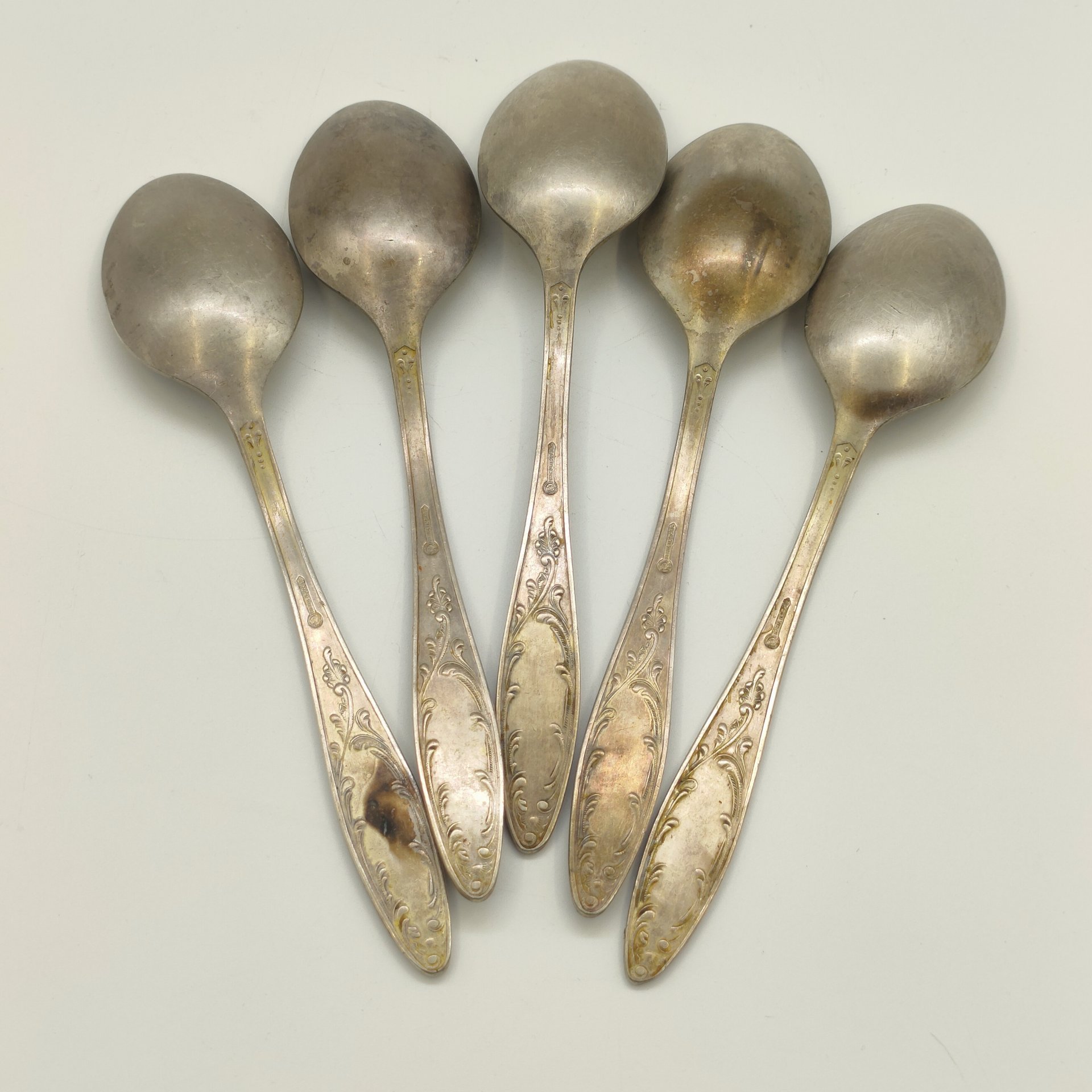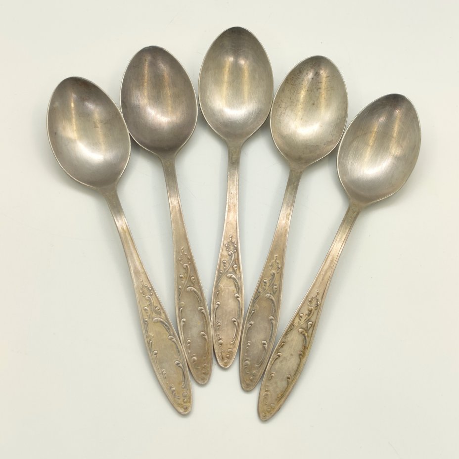 Набор из пяти десертных ложек с растительным декором (в подборе), мНЦ (медь-никель-цинк), Кольчугинский завод цветных металлов, СССР, 1962-1991 гг.