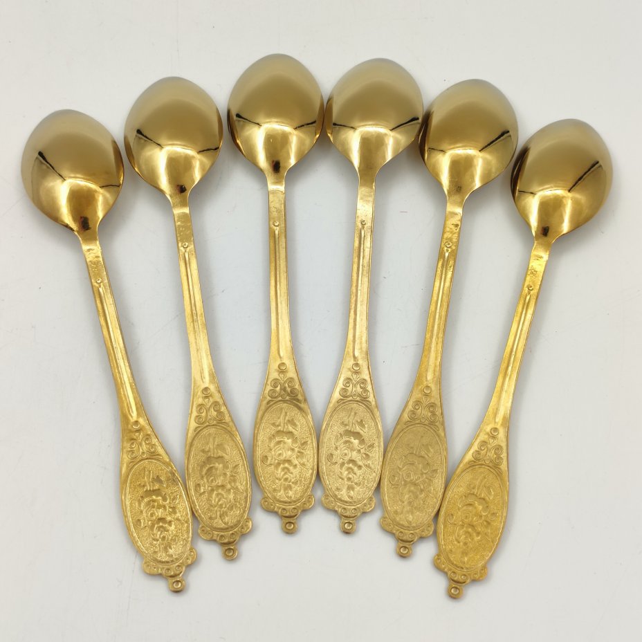 Набор из 6-ти чайных ложек, украшенных геометрическим декором, клеймо СМЗ, алюминий, золочение, СССР, 1970-1990 гг.