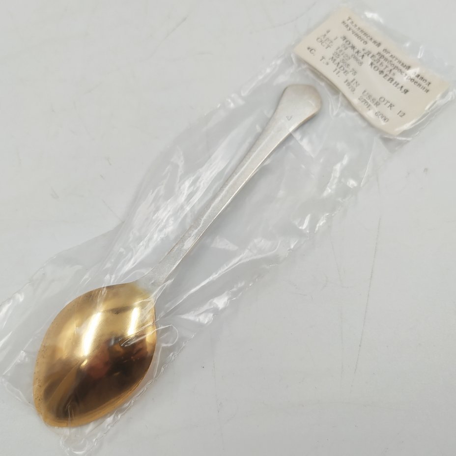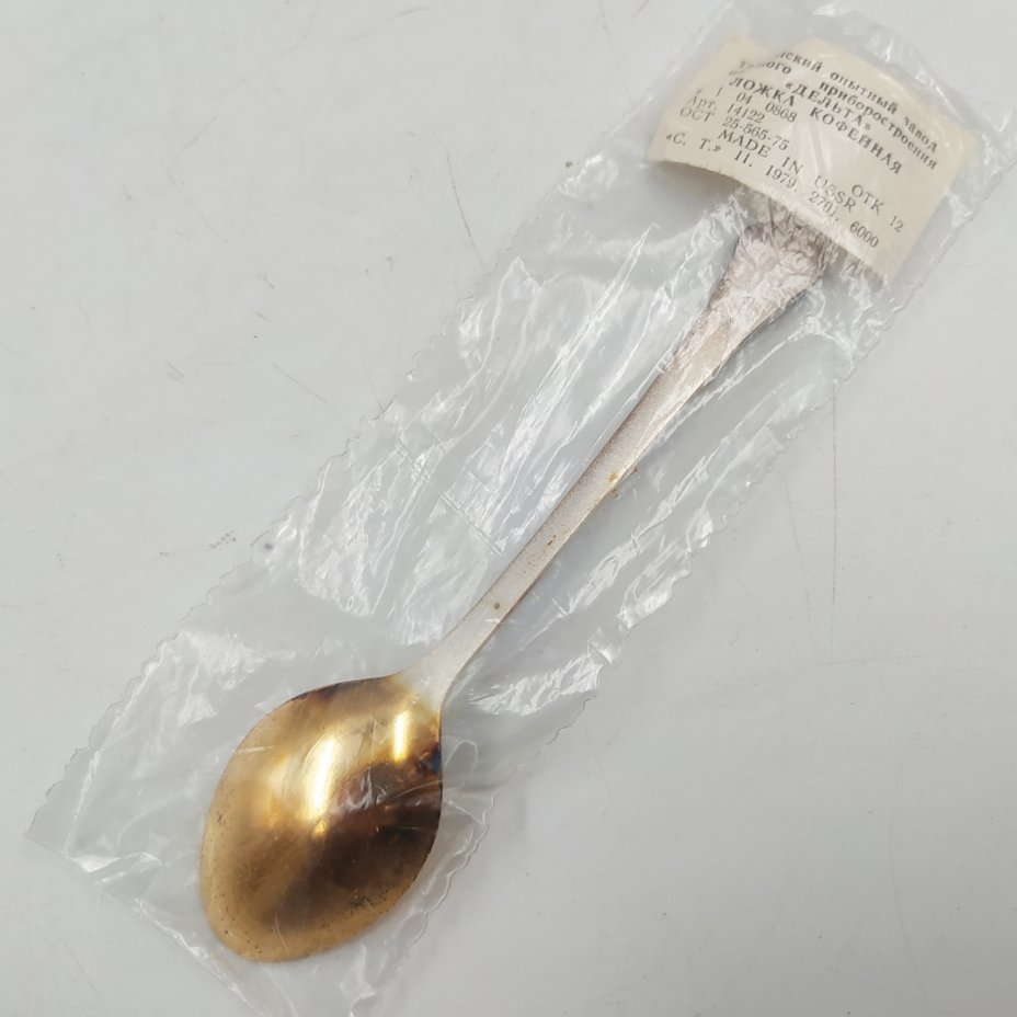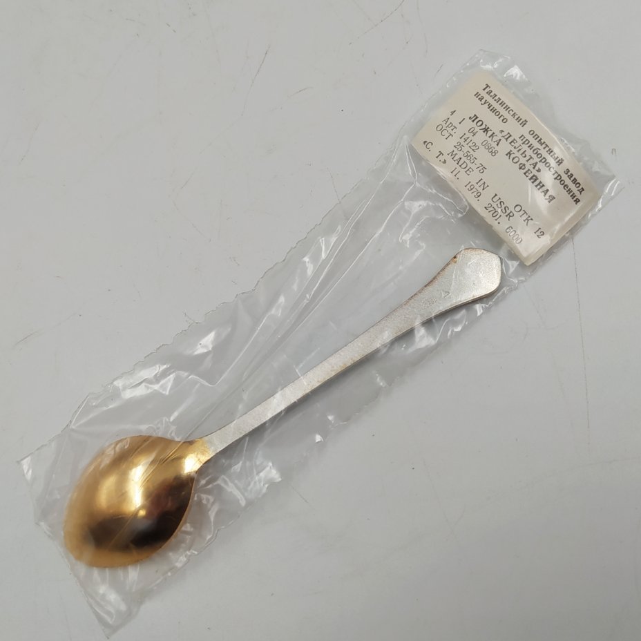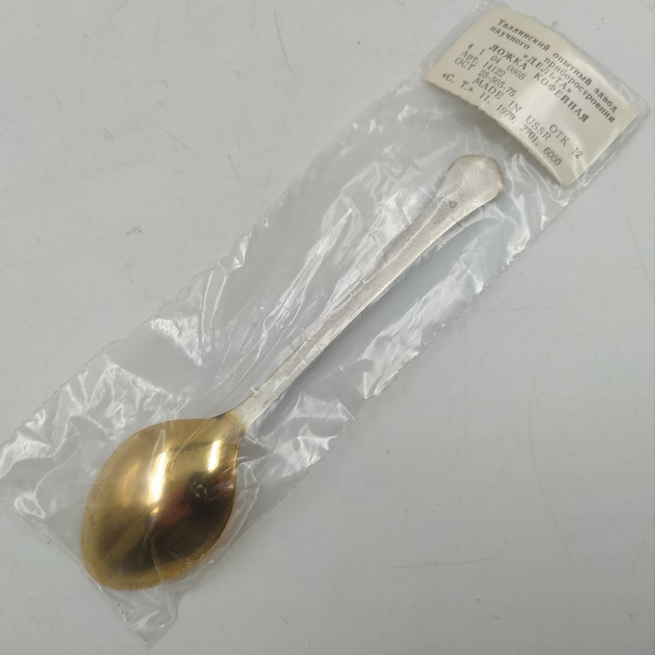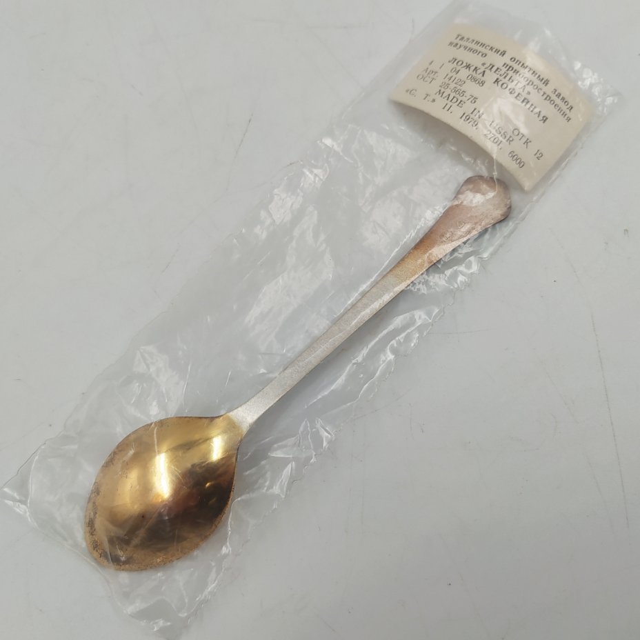 Ложка кофейная в оригинальном пакете с этикеткой, Таллинский опытный завод научного приборостроения "Дельта", мельхиор (медь-никель), золочение, СССР, 1979 г.