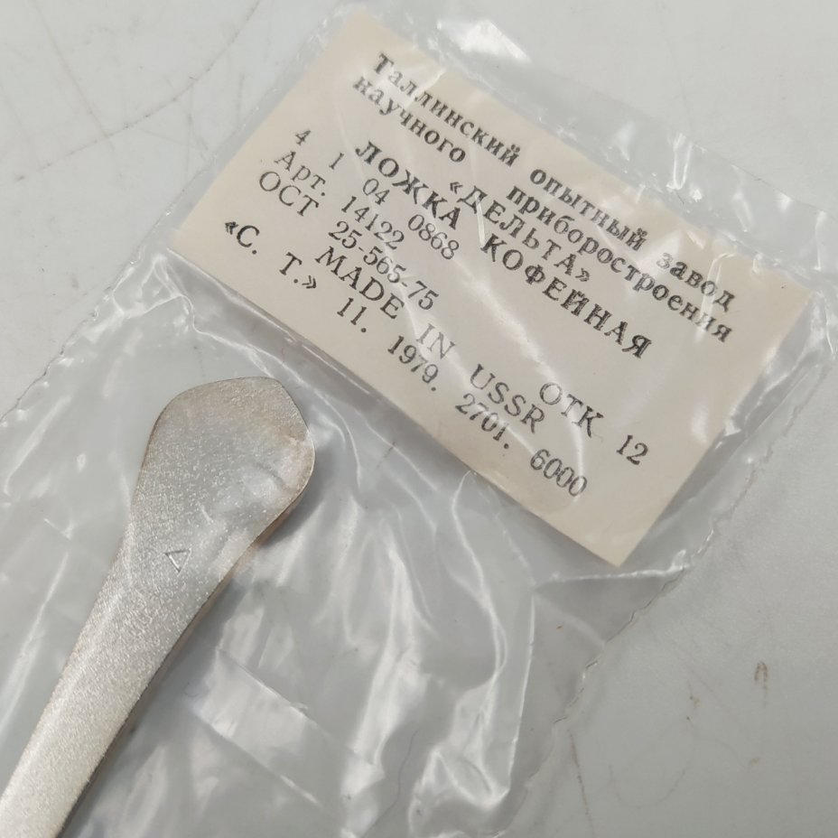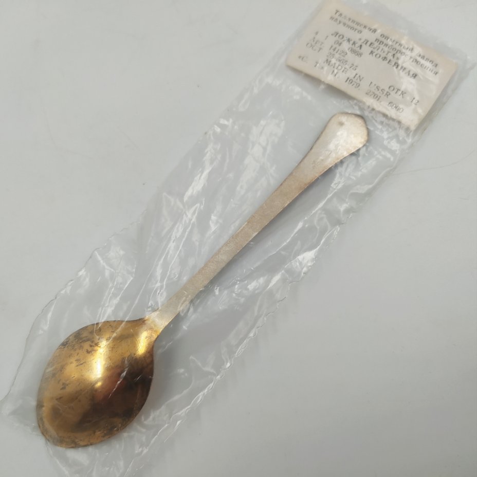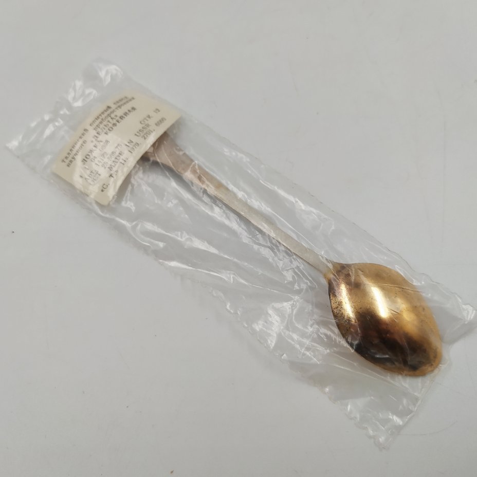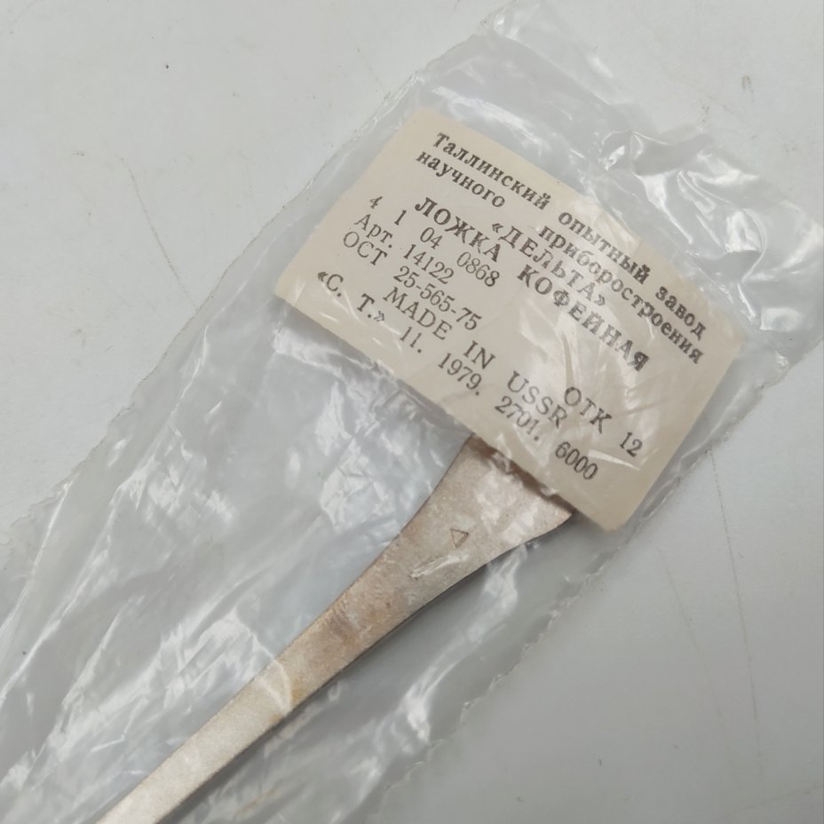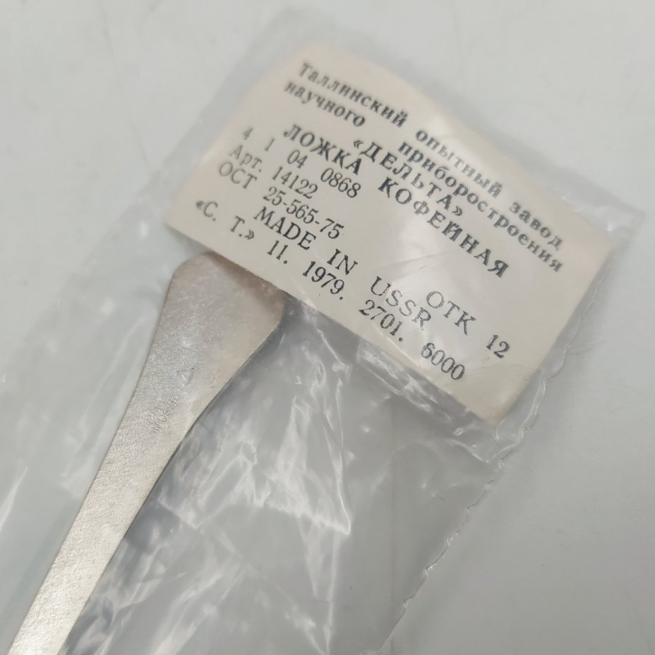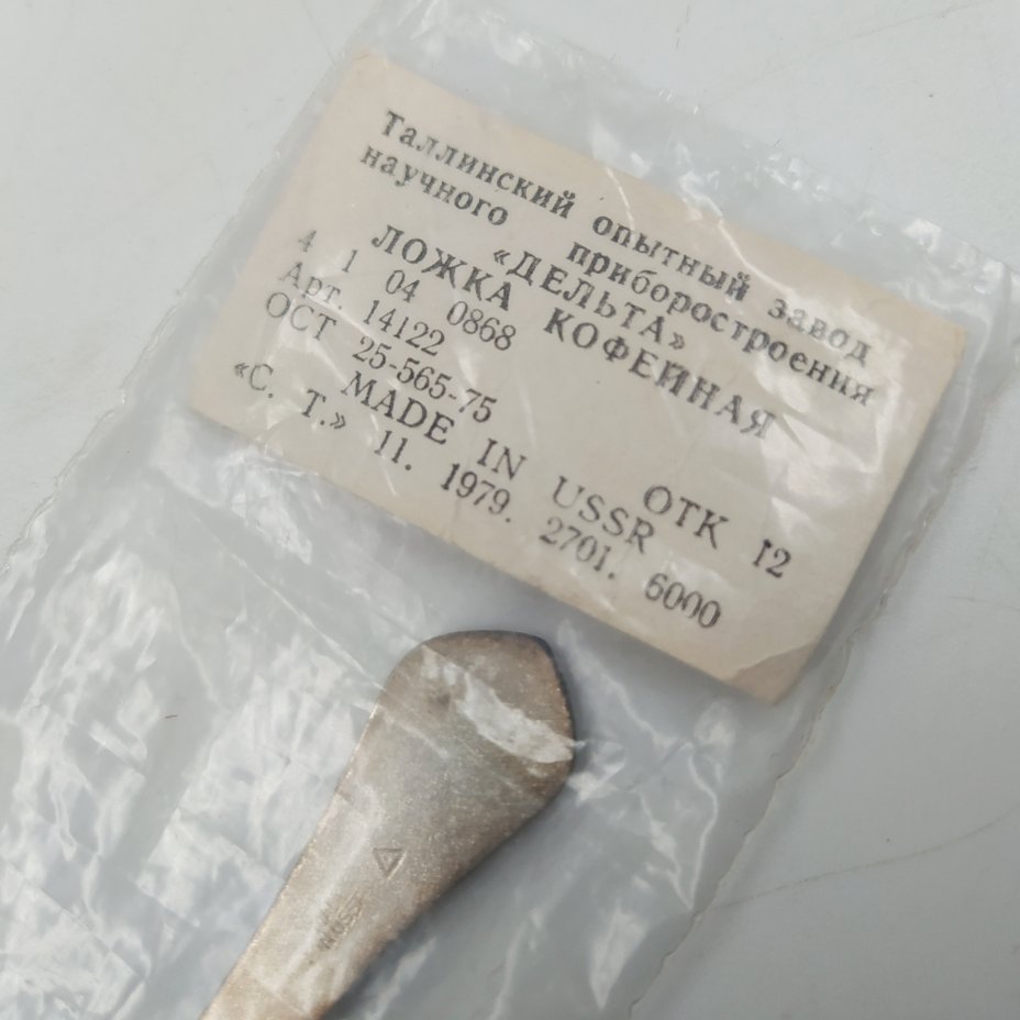 Ложка кофейная в оригинальном пакете с этикеткой, Таллинский опытный завод научного приборостроения "Дельта", мельхиор (медь-никель), золочение, СССР, 1979 г.