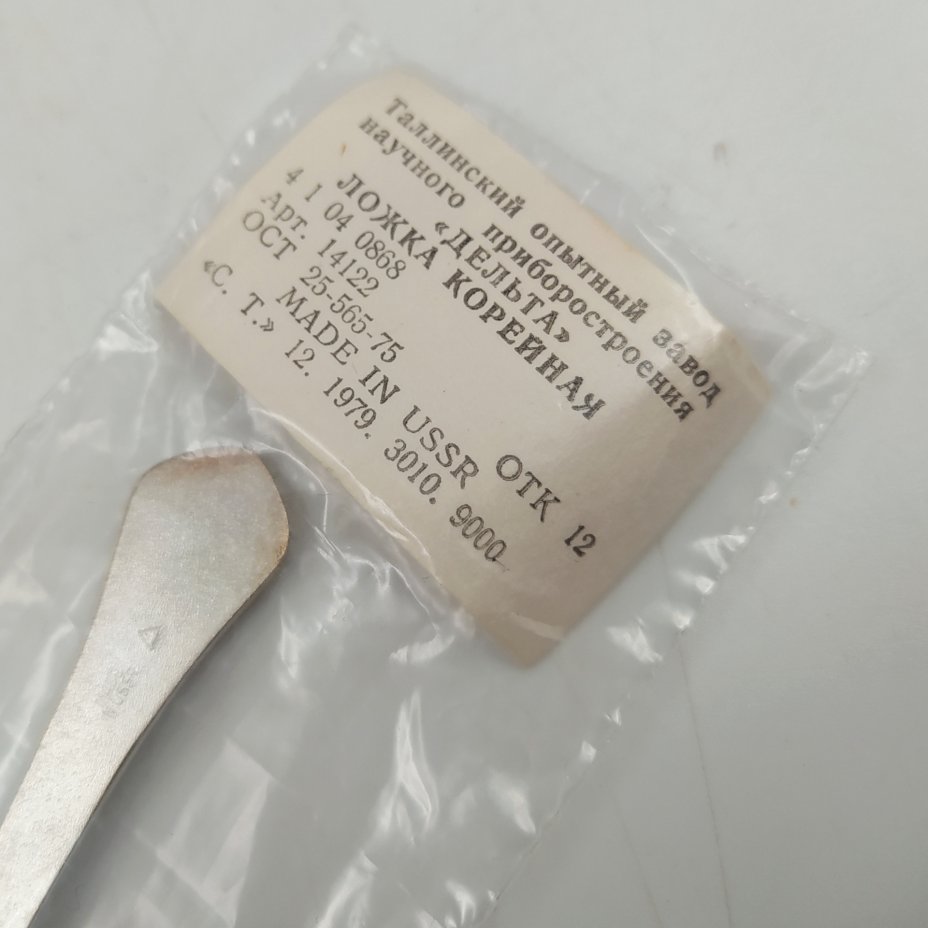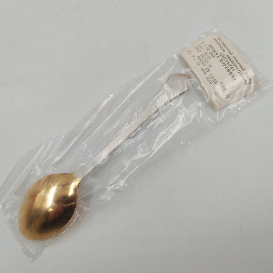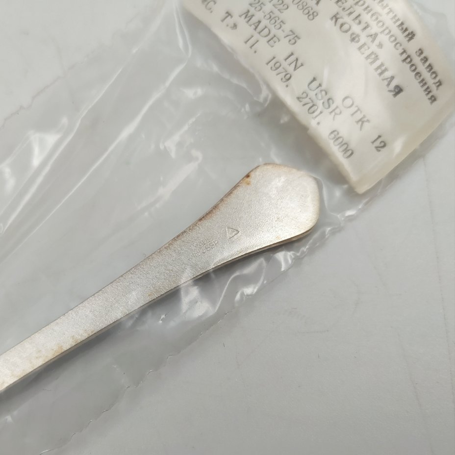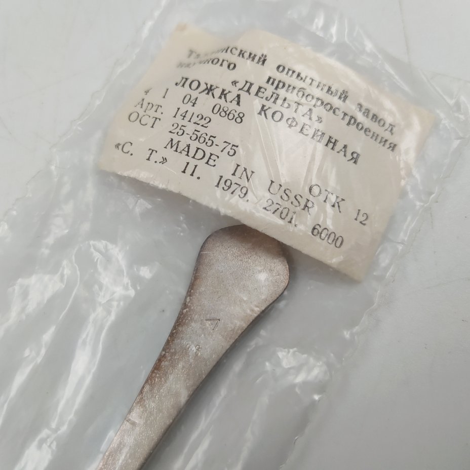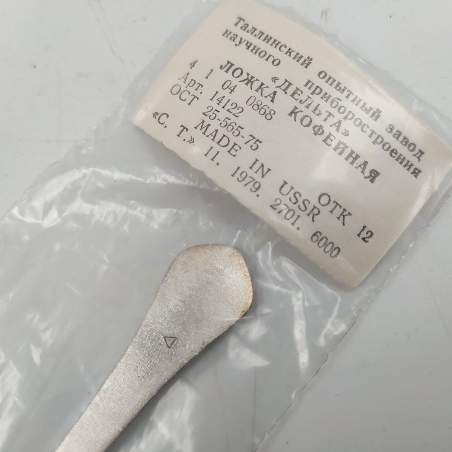 Ложка кофейная в оригинальном пакете с этикеткой, Таллинский опытный завод научного приборостроения "Дельта", мельхиор (медь-никель), золочение, СССР, 1979 г.