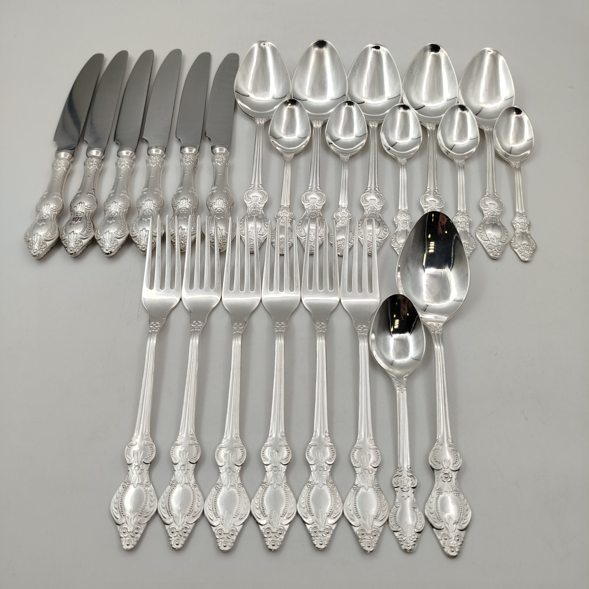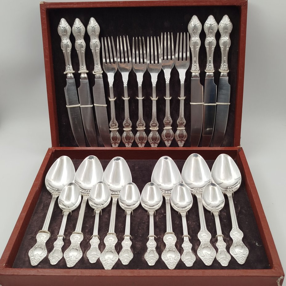 Набор сервировочный (лопатка для торта, совочек для сахара, вилка двузубая и вилка трехзубая), мНЦ (медь-никель-цинк), Таллинский ювелирный завод, СССР, 1960-1990 гг.