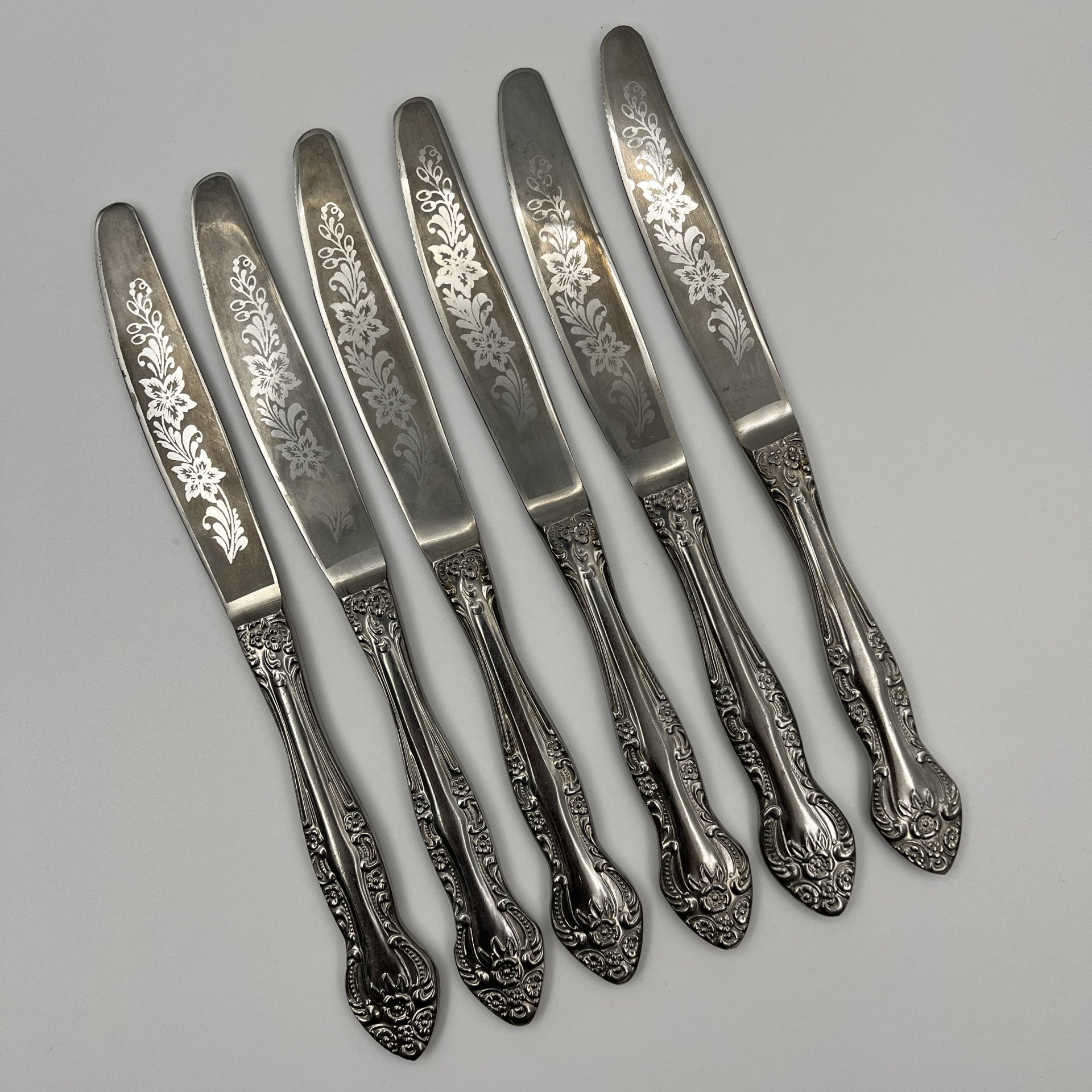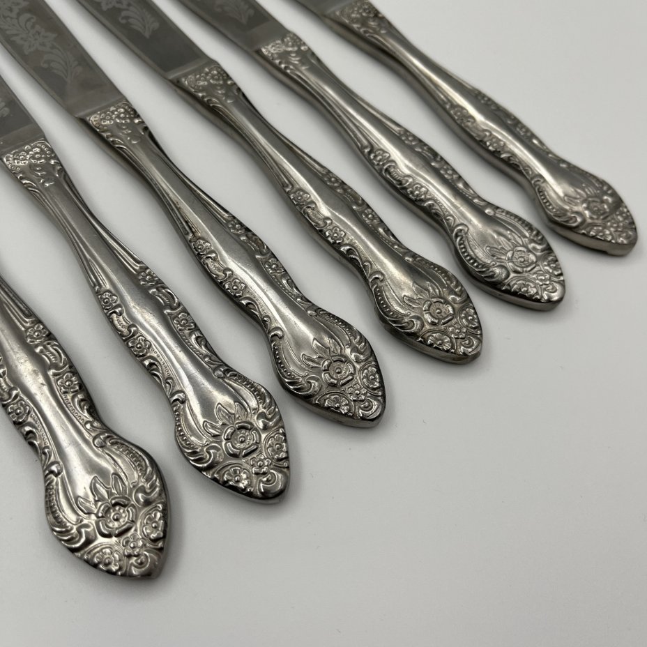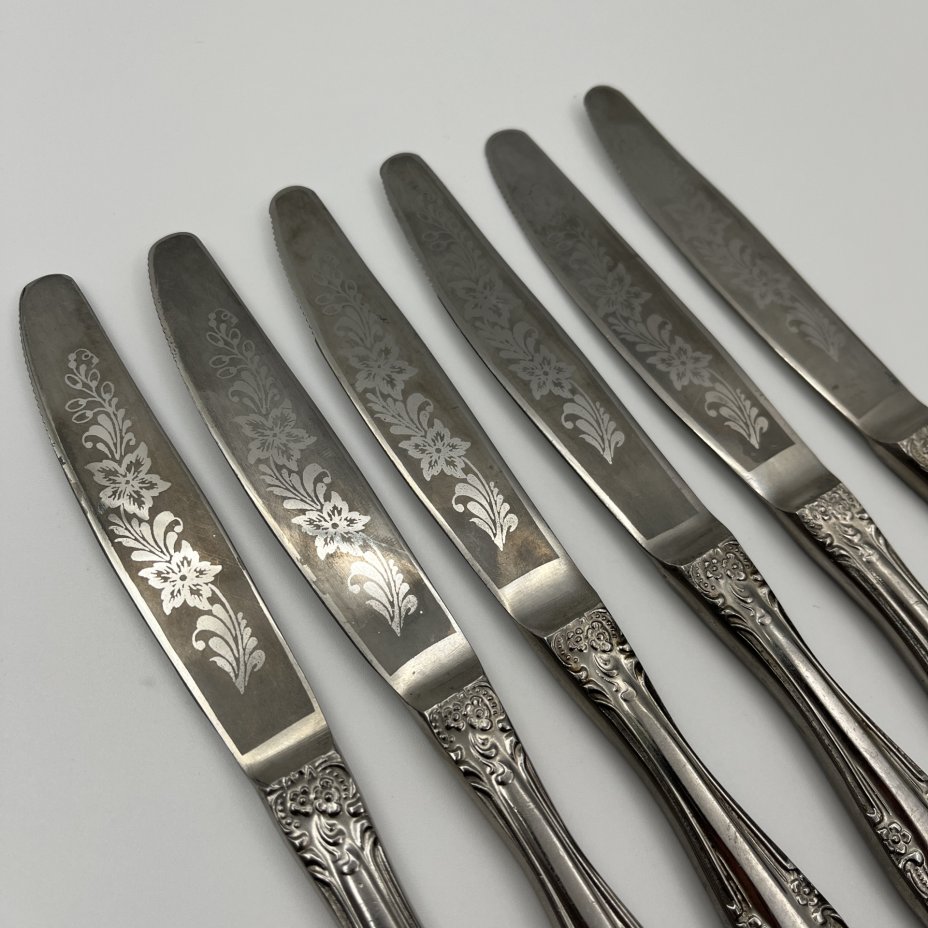 Набор из 6 столовых ножей, украшенных растительным декором, нержавеющая сталь, Павловский завод художественных металлоизделий им. С.М. Кирова, СССР, 1970-1990 гг.