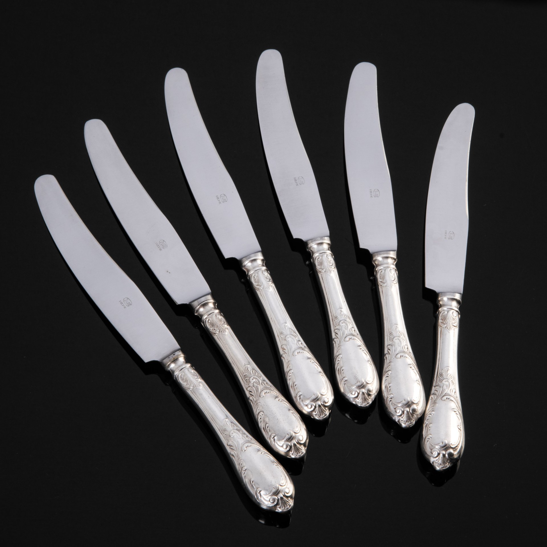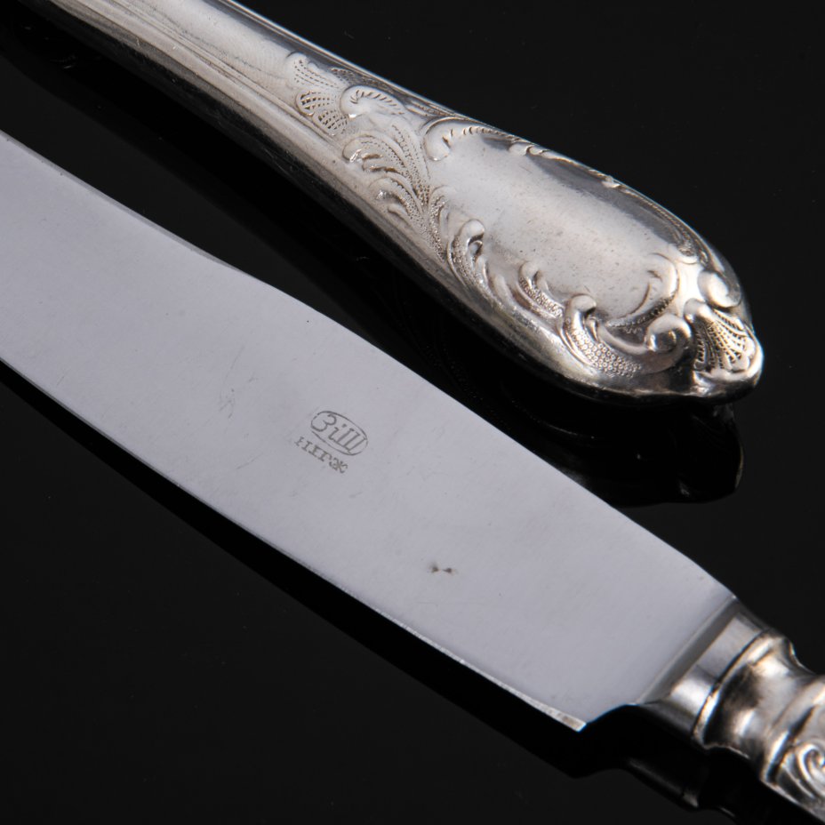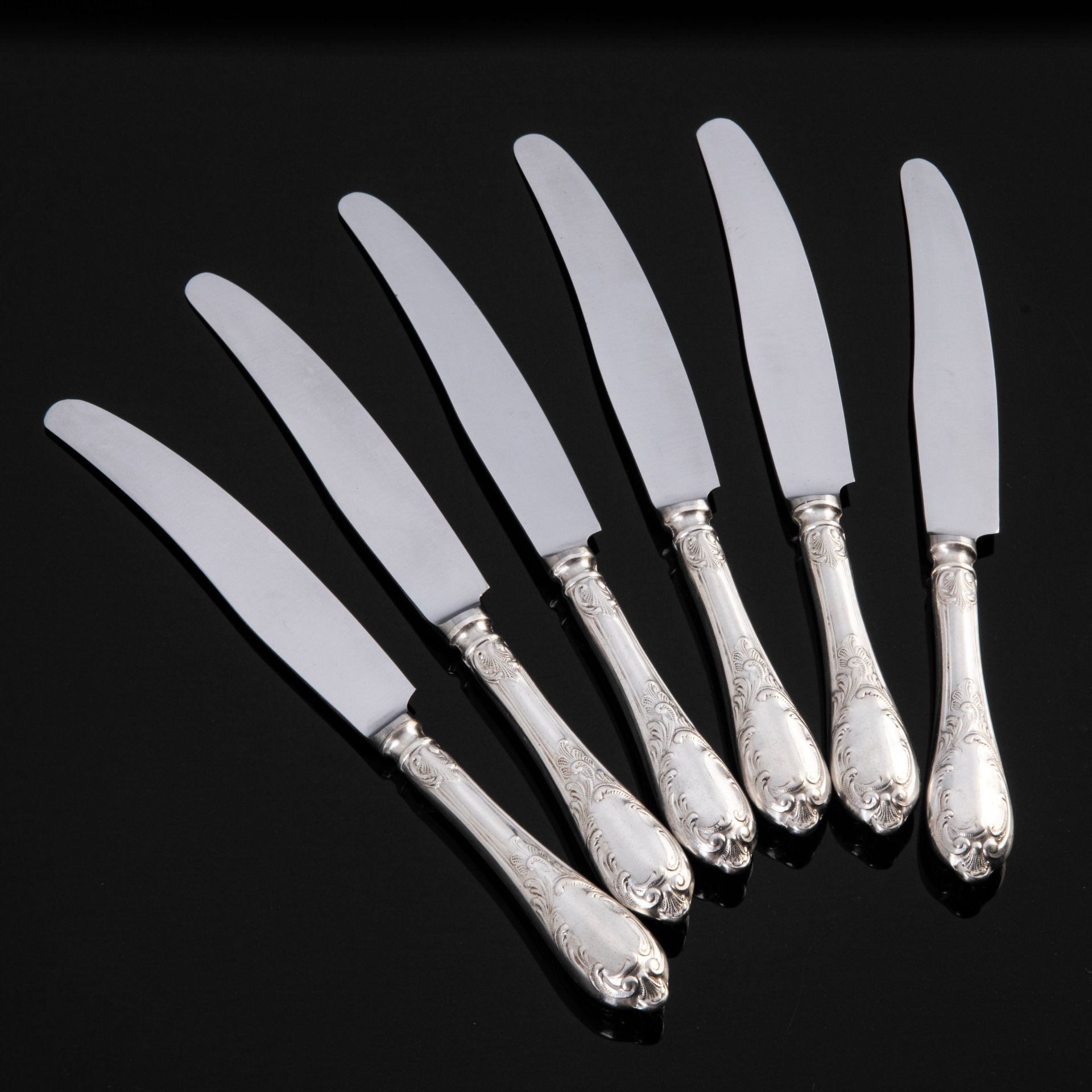 Набор из шести столовых ножей с растительным декором, мНЦ (медь-никель-цинк), нержавеющая сталь, Вольнянский завод столовых приборов им. Шевченко (ЗiШ, ЗиШ), СССР, 1960-1990 гг.
