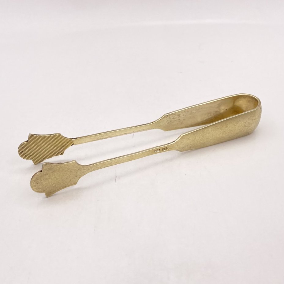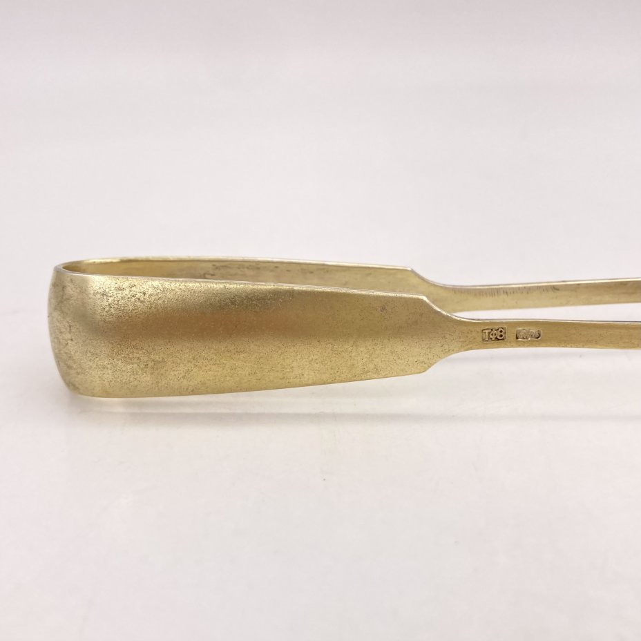 Щипцы для сахара с растительным декором, мастер-монограммист "Р.И.", серебро 84 пробы, золочение, гравировка, Российская империя, 1868 г.
