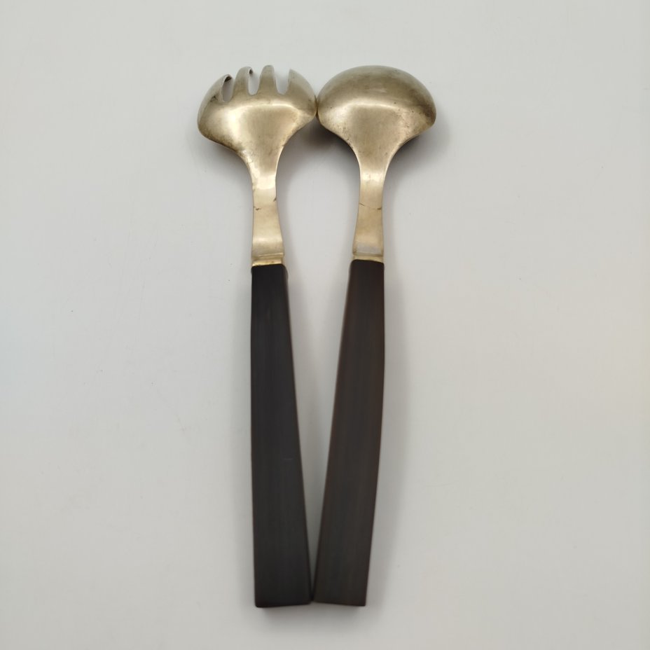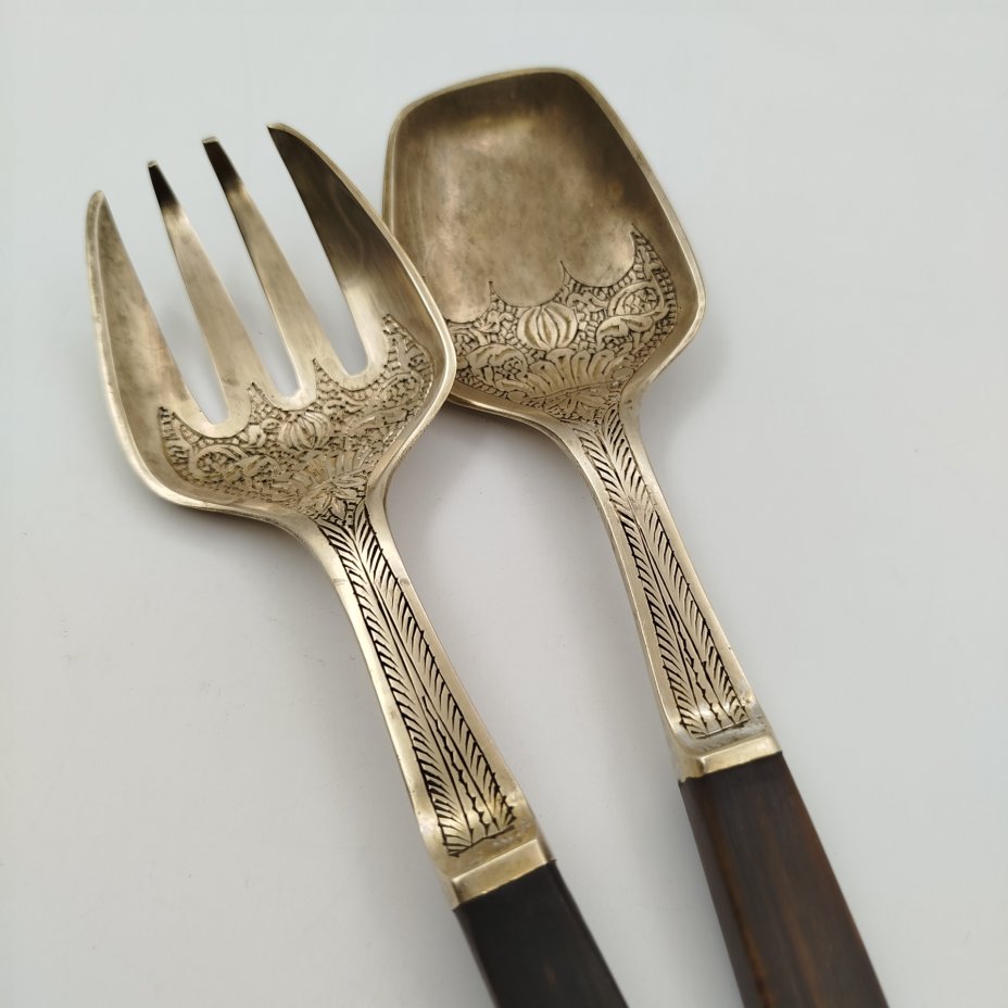 Набор для подачи салата (ложка и вилка) с растительным декором, латунь, серебрение, Индия, 1960-1980 гг.