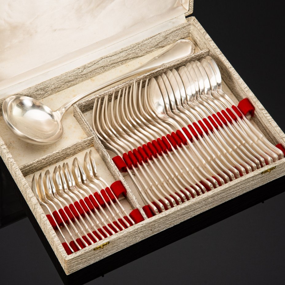 Набор столовых приборов на 12 персон в футляре (37 предметов), фирма "A La Gerbe D'or ", металл, серебрение, фанера, Франция, 1950-1970 гг.