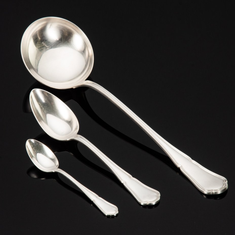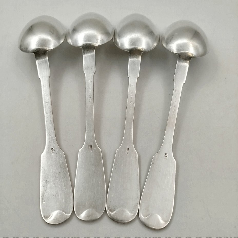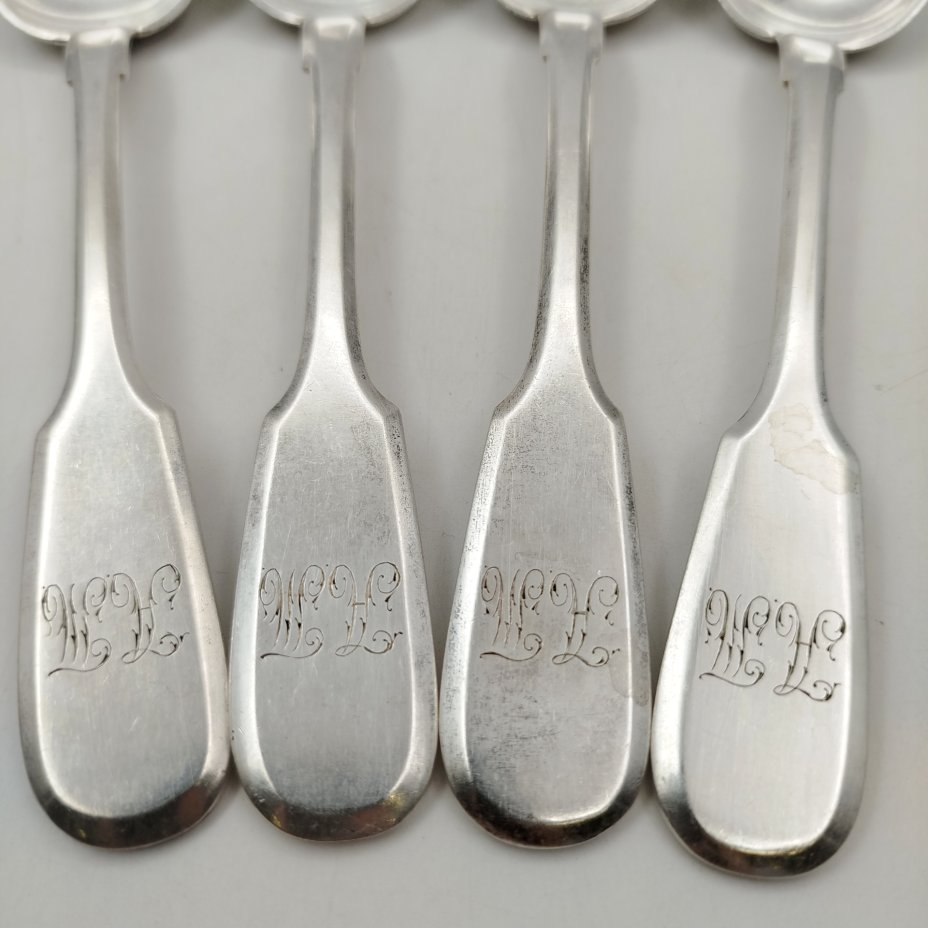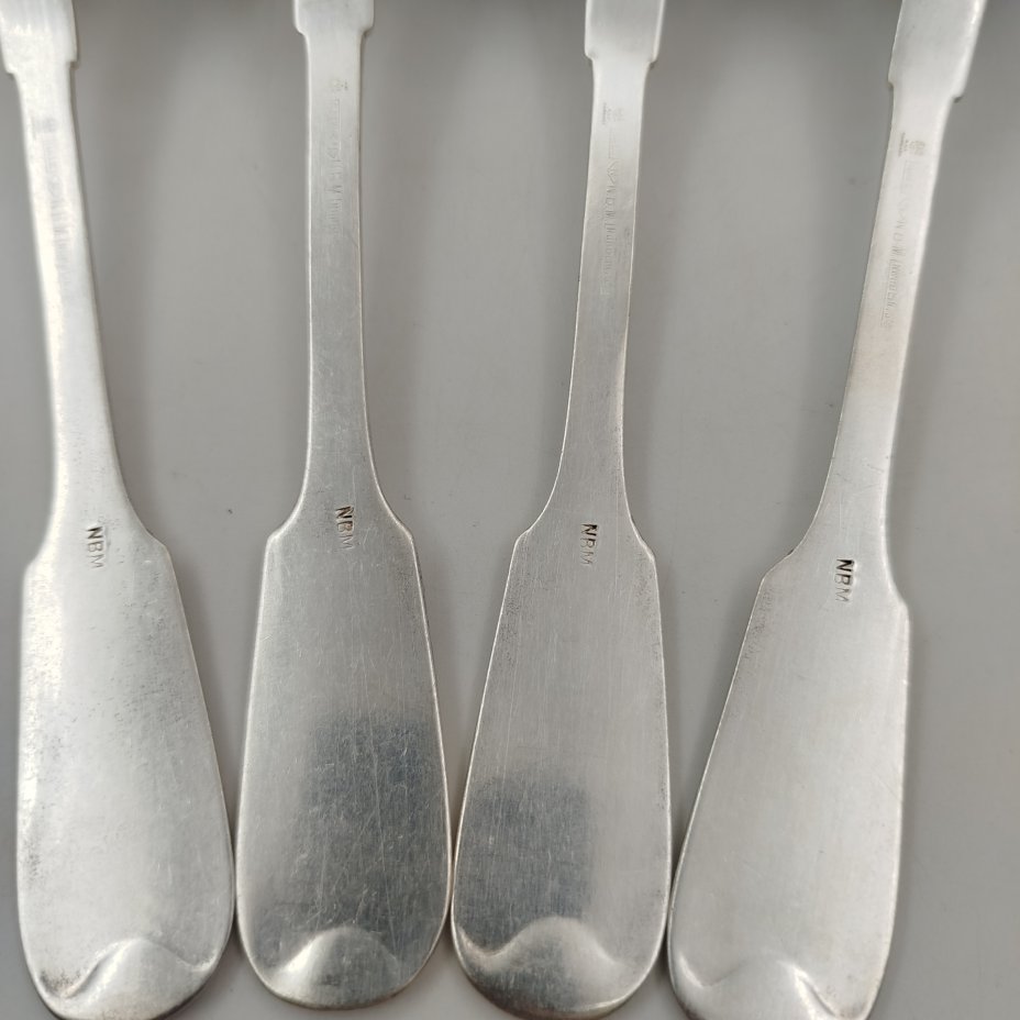 Набор из 4-х столовых ложек, украшенных монограммой "А Т", латунь, серебрение, Norblin & Co (Норблин), Российская империя, 1896-1917 гг.