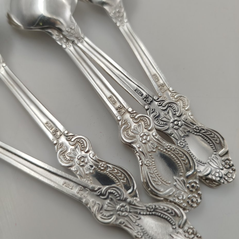 Набор из 6-ти чайных ложек, украшенных растительным декором, мНЦ (медь-никель-цинк), Режевский механический завод (РМ), СССР, 1970-1990 гг.