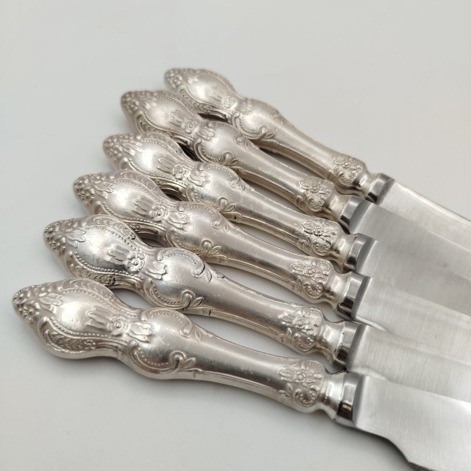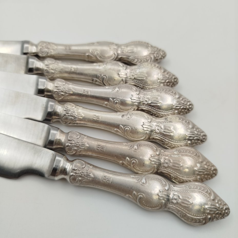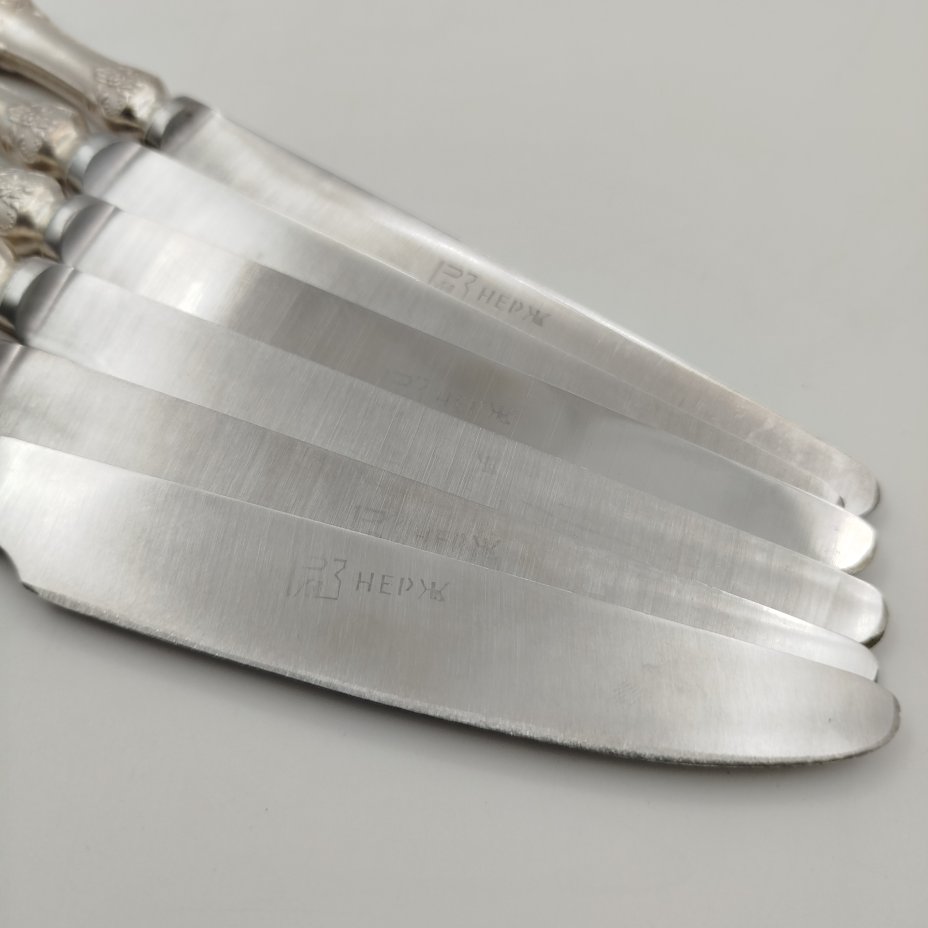 Набор из 6-ти столовых ножей, украшенных растительным декором, мНЦ (медь-никель-цинк), нержавеющая сталь, Режевский механический завод (РМ), СССР, 1983-1991 гг.