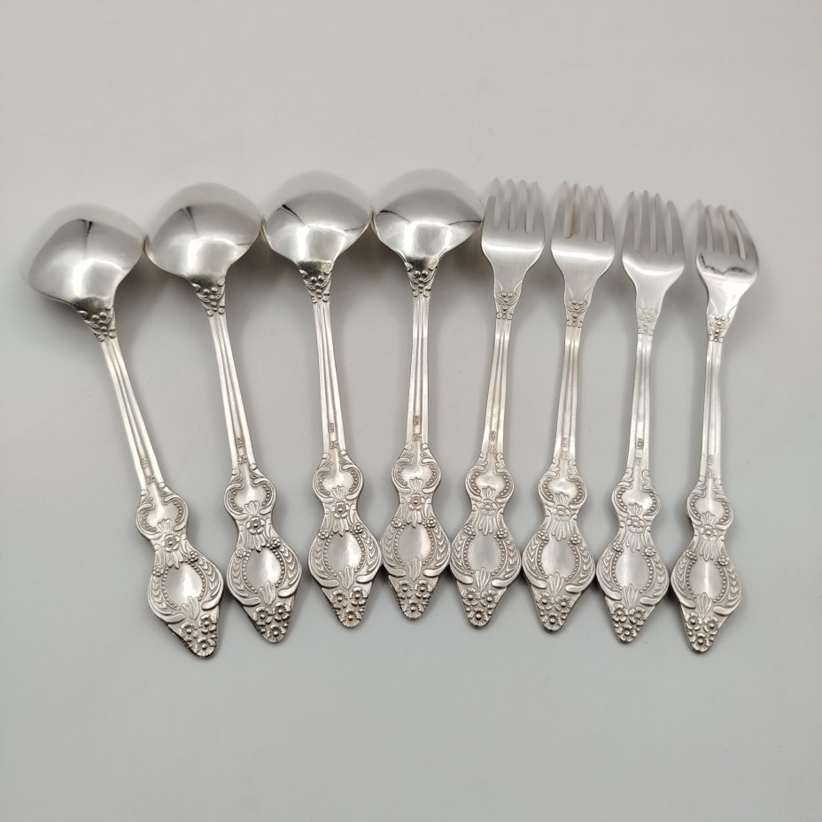 Набор столовых приборов на 4 персоны, украшенных растительным декором (4 ложки и 4 вилки), мНЦ (медь-никель-цинк), Режевский механический завод (РМ), СССР, 1983-1991 гг.