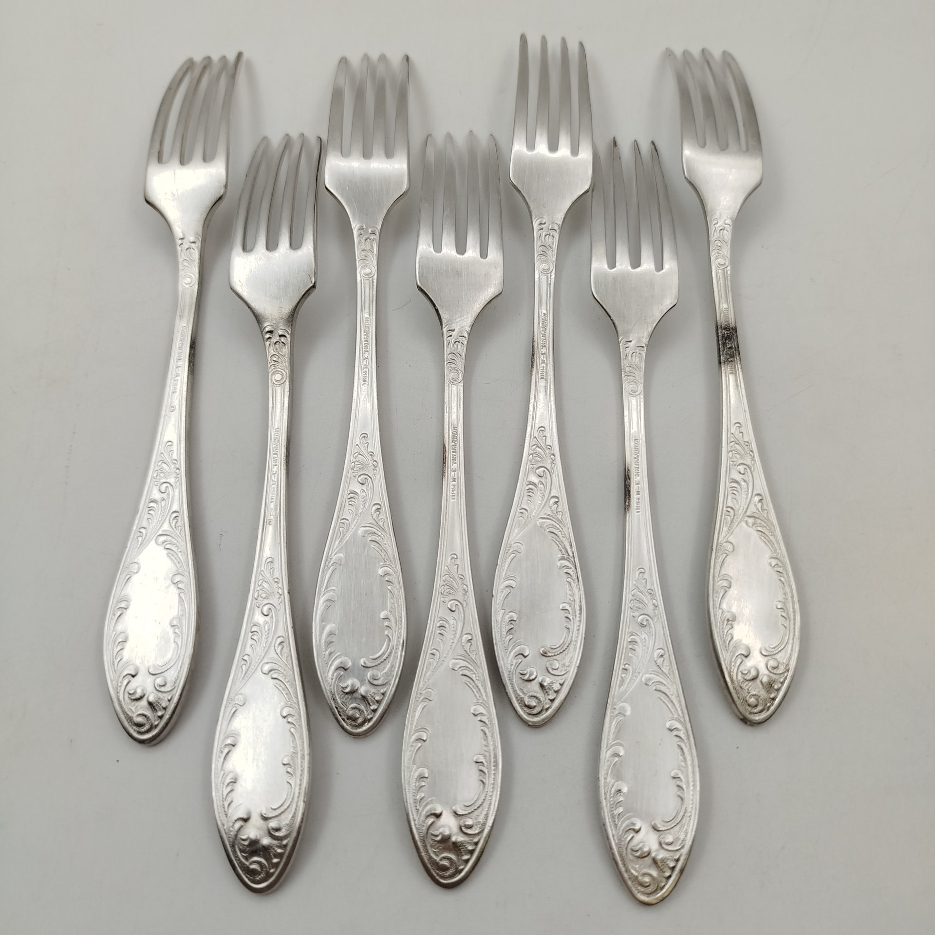 Купить Набор из семи десертных вилок "Пламя", мНЦ (медь-никель-цинк), Кольчугинский завод цветных металлов, СССР, 1960-1990 гг.
