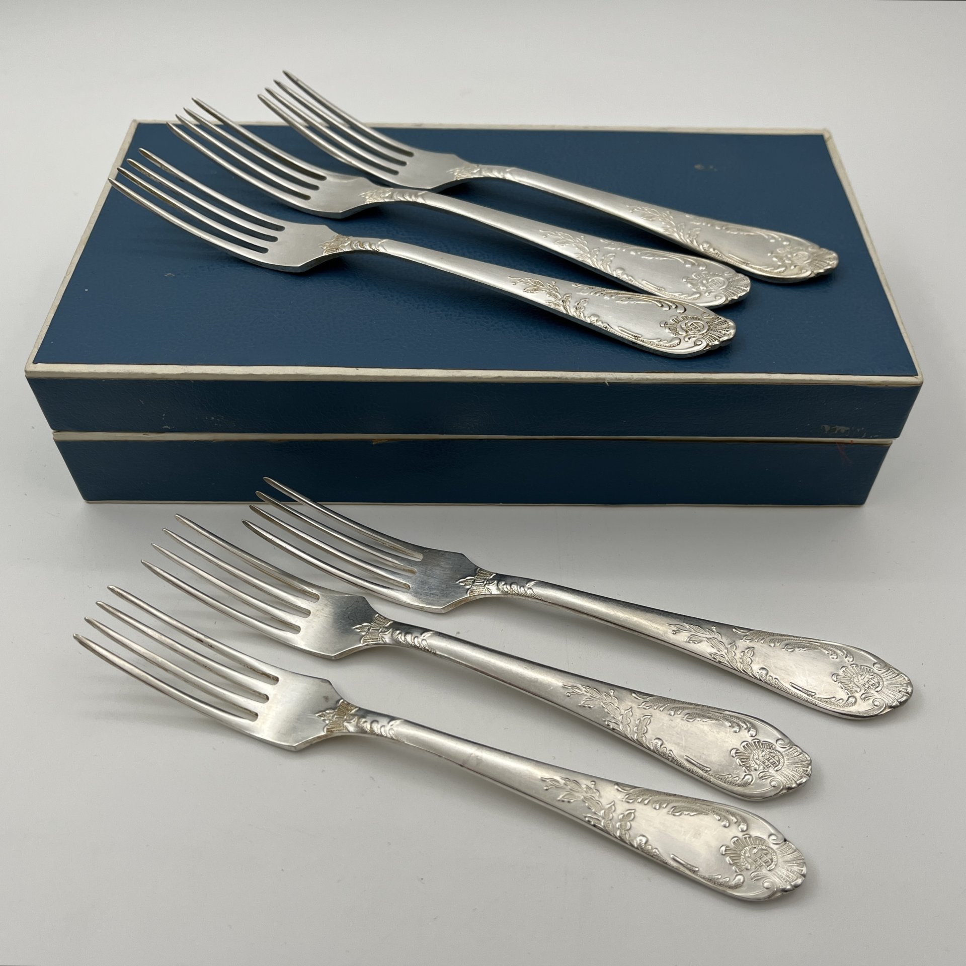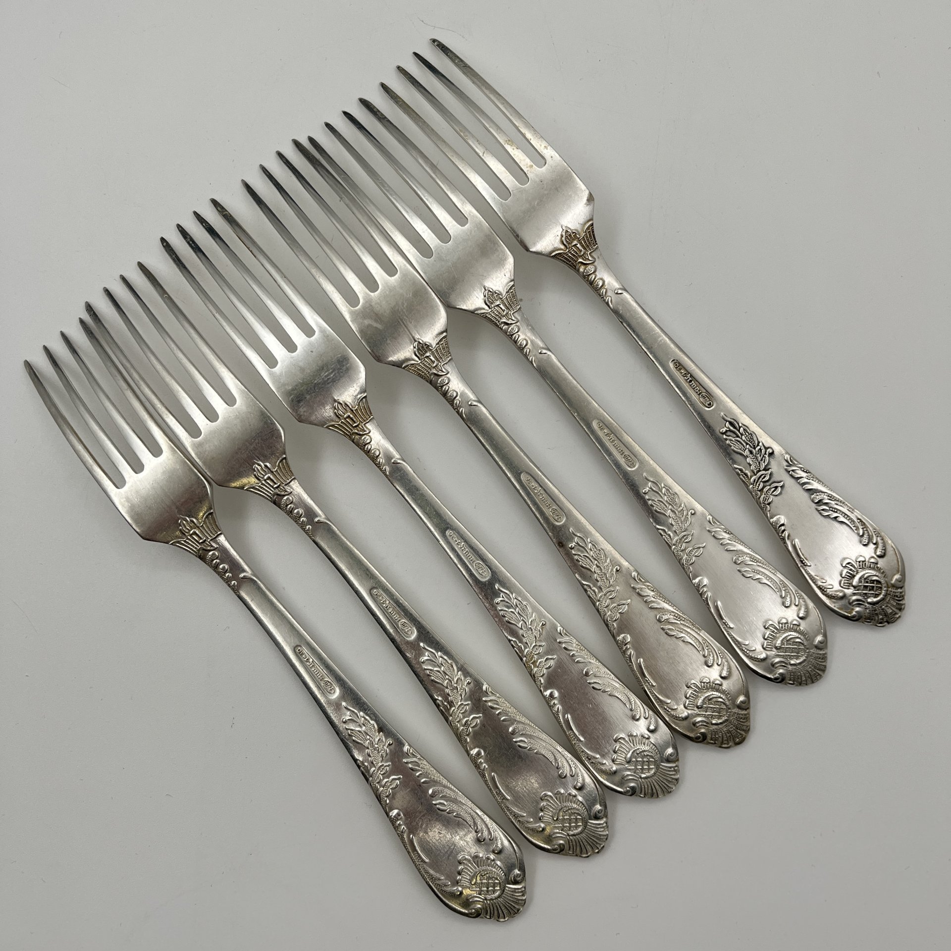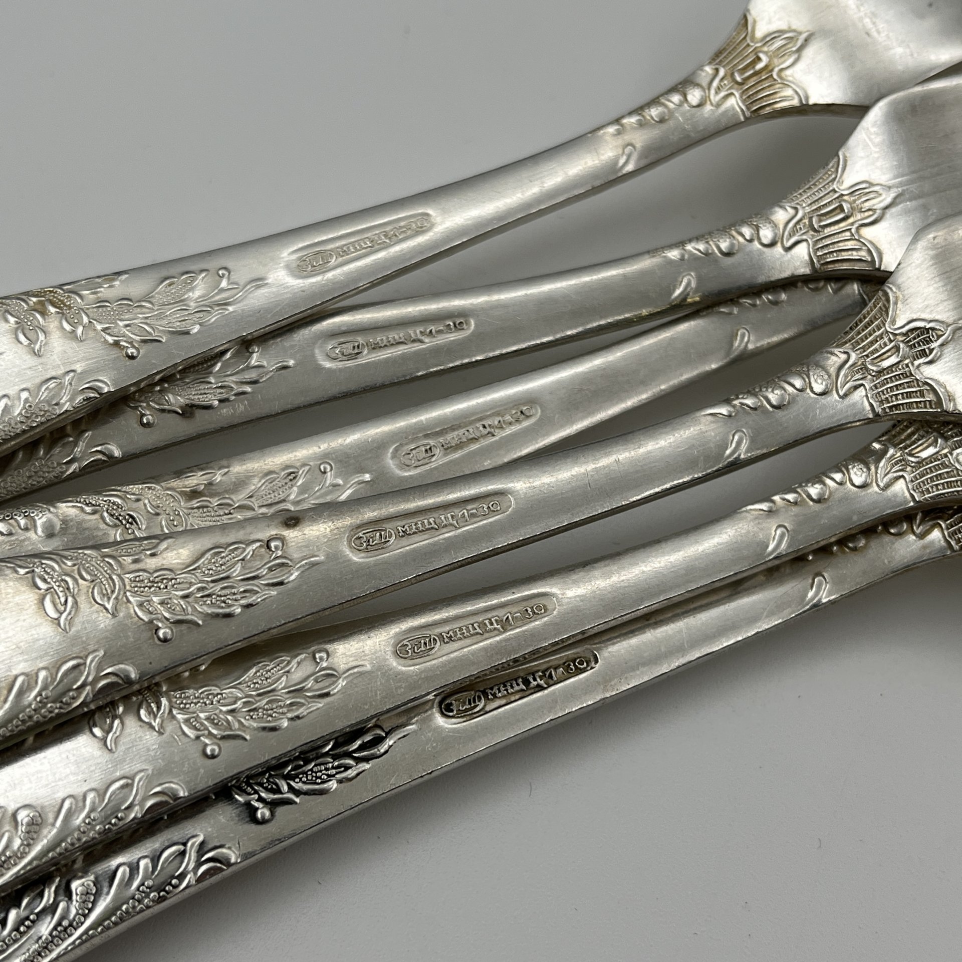 Набор из шести десертных вилок с растительным декором, мНЦ (медь-никель-цинк), картон, Вольнянский завод столовых приборов им. Шевченко (ЗiШ, ЗиШ), СССР, 1960-1990 гг.