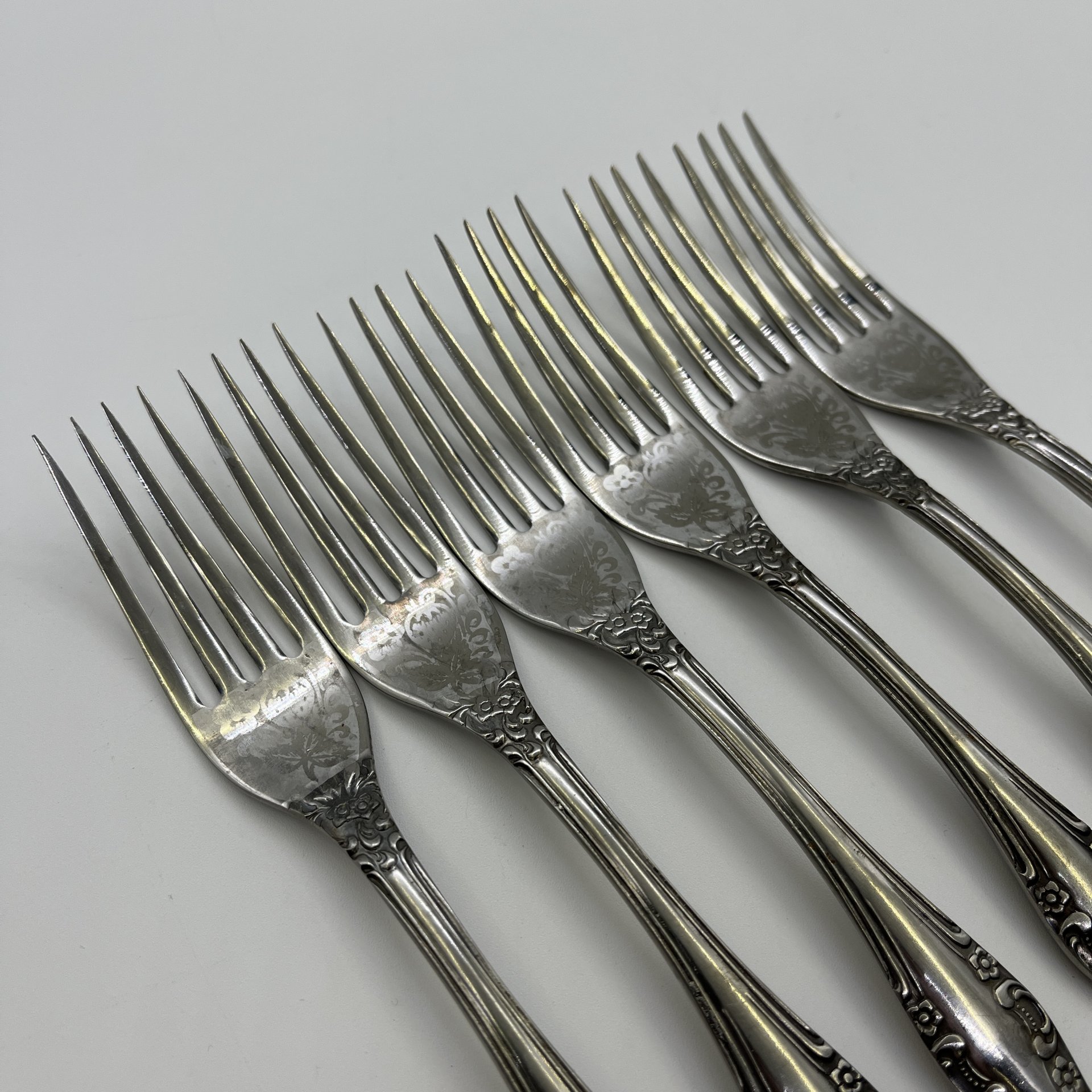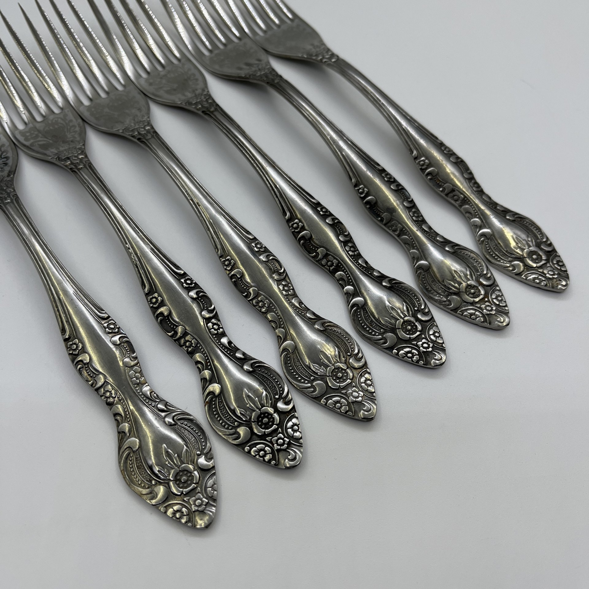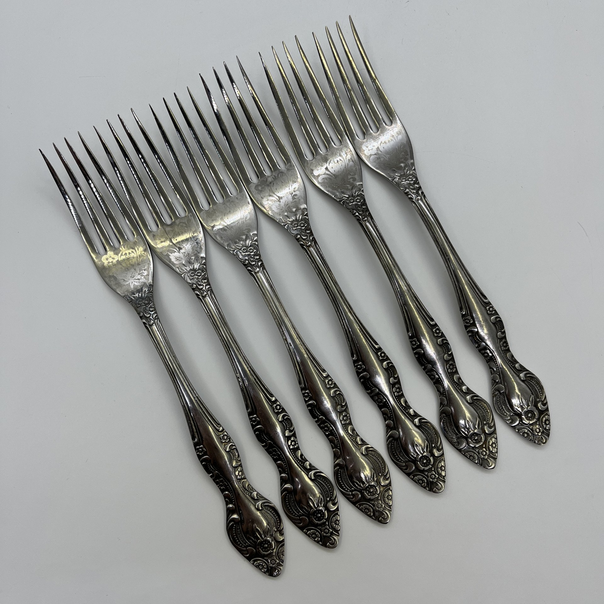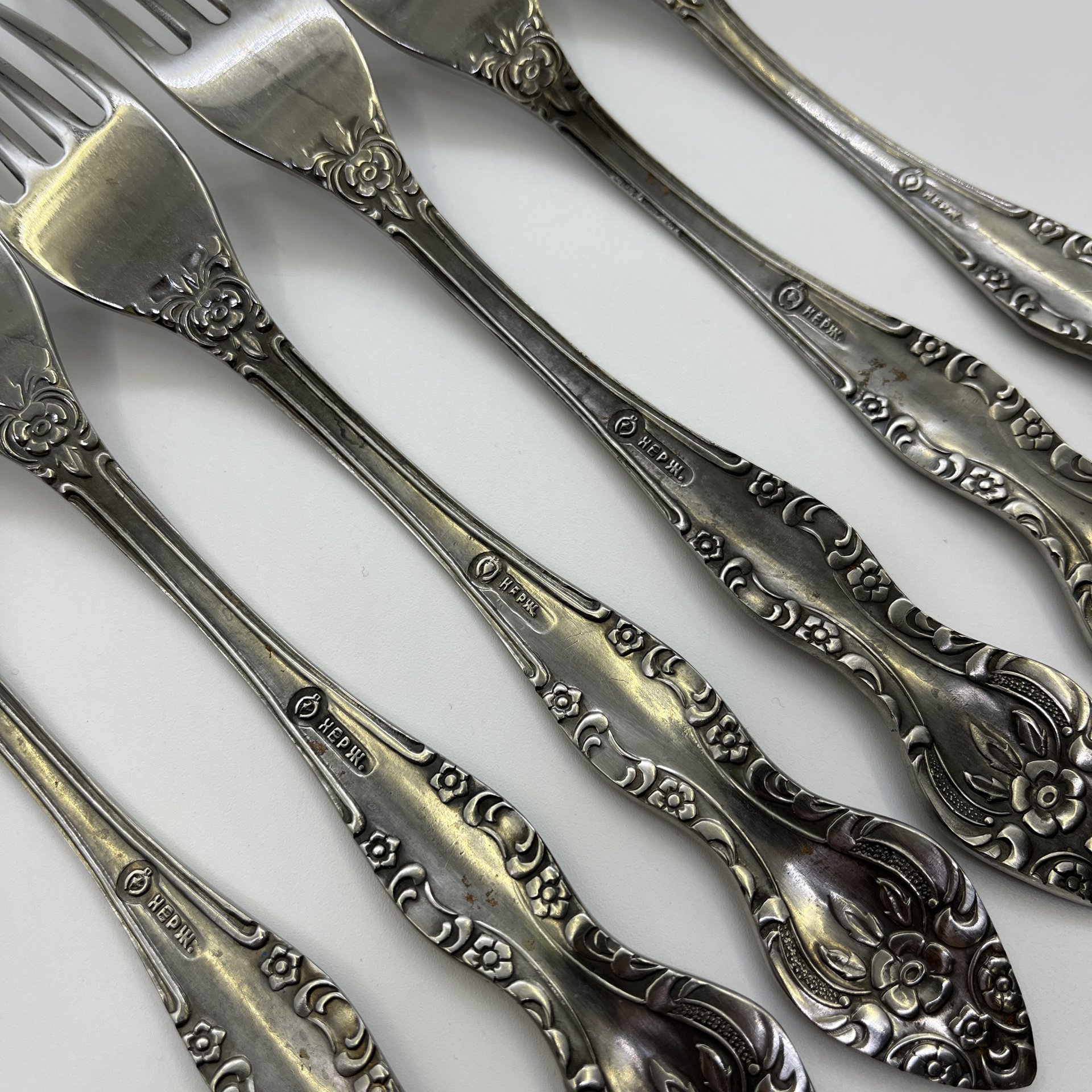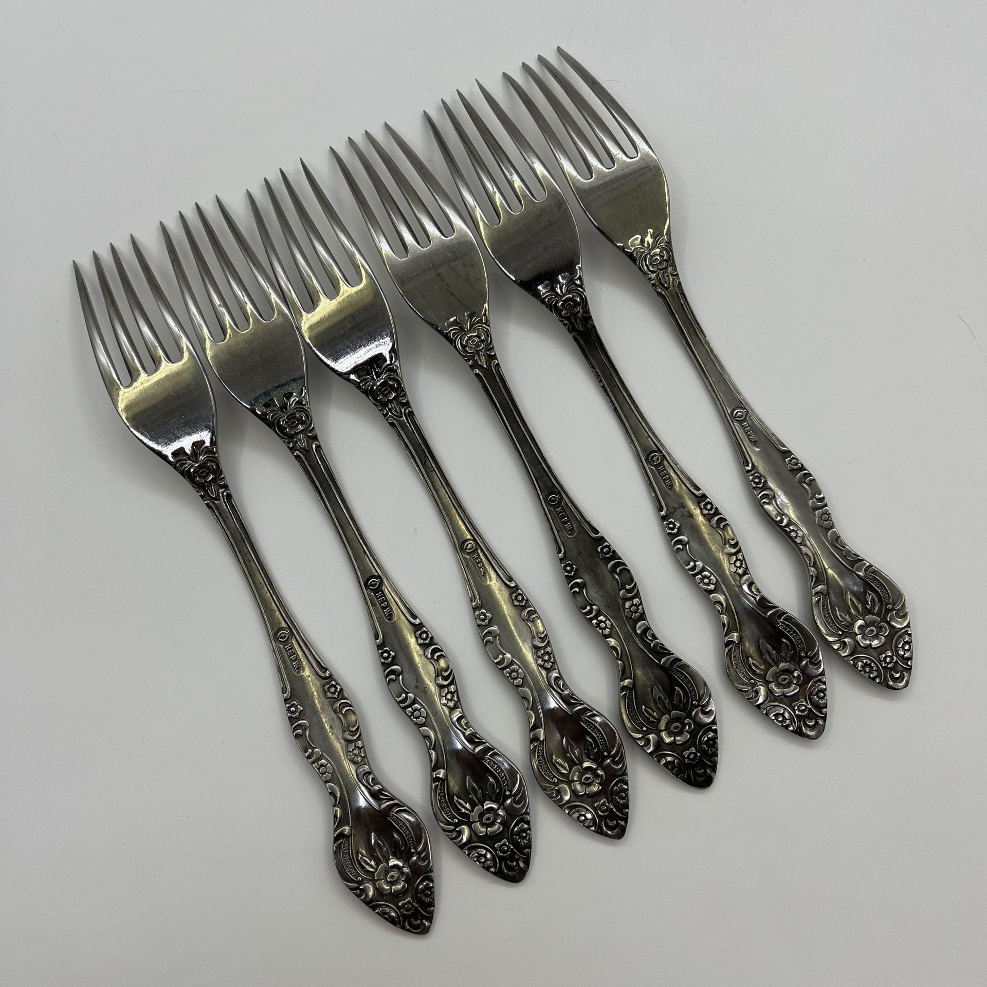 Набор столовых вилок с растительным декором на 6 персон, мНЦ (медь-никель-цинк), Вольнянский завод столовых приборов им. Шевченко (ЗiШ, ЗиШ), СССР, 1960-1990 гг.
