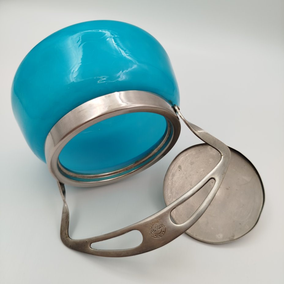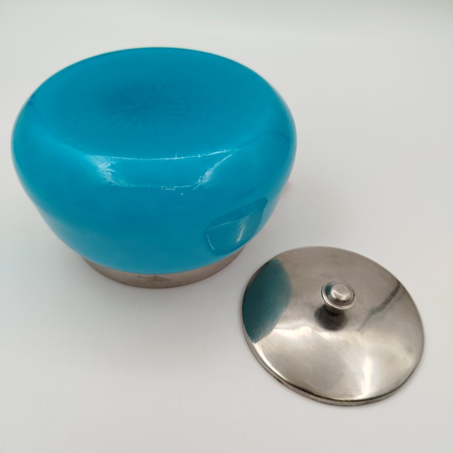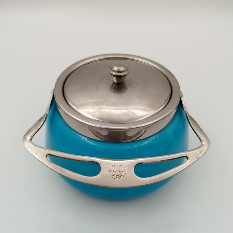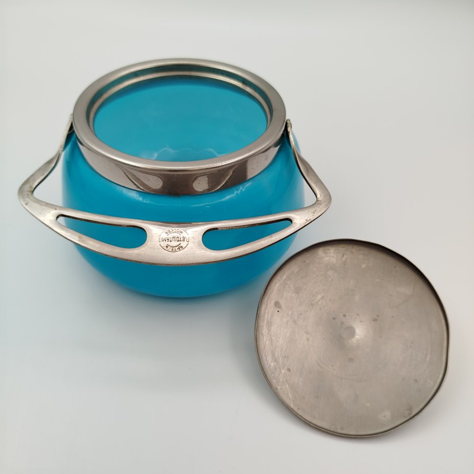 Сахарница бирюзового оттенка, стекло, металл, серебрение, УПК «Автоштамп», Москва, СССР, 1940-1960 гг.