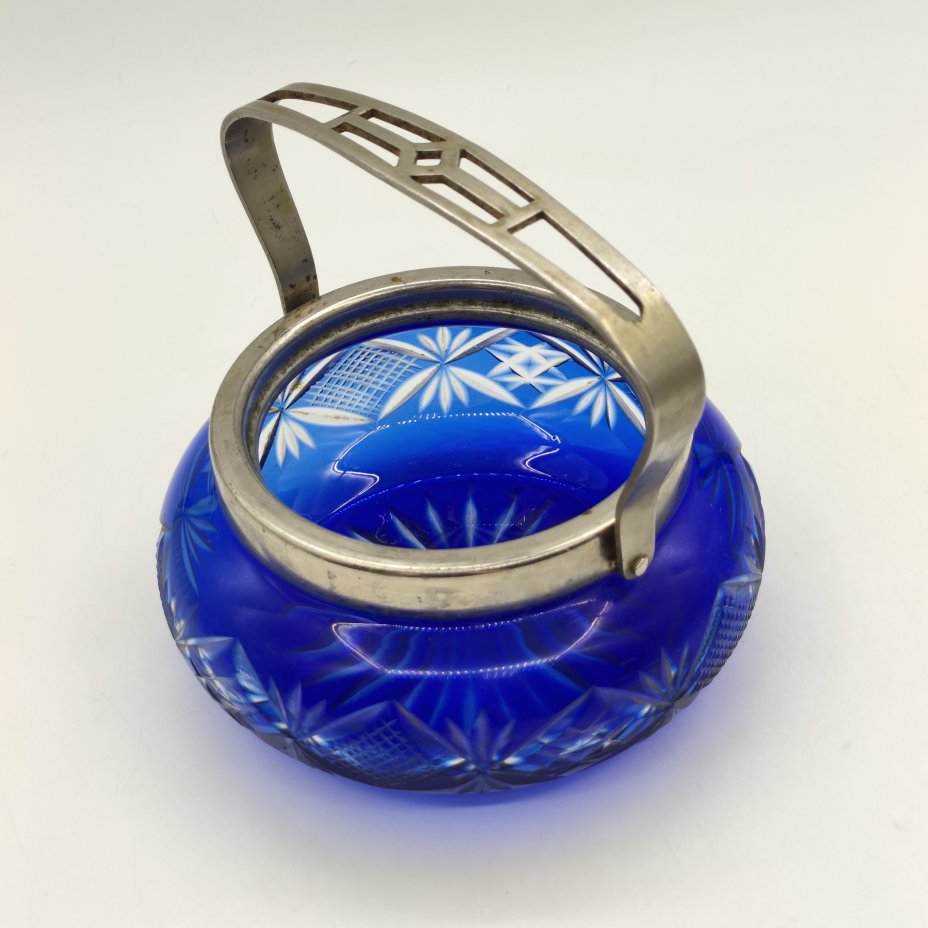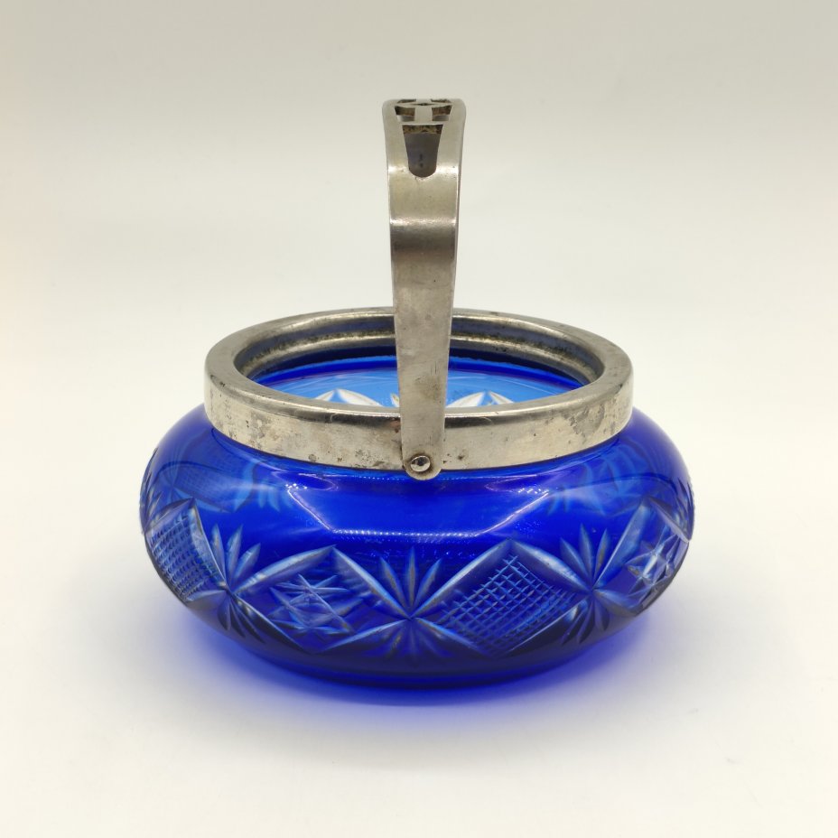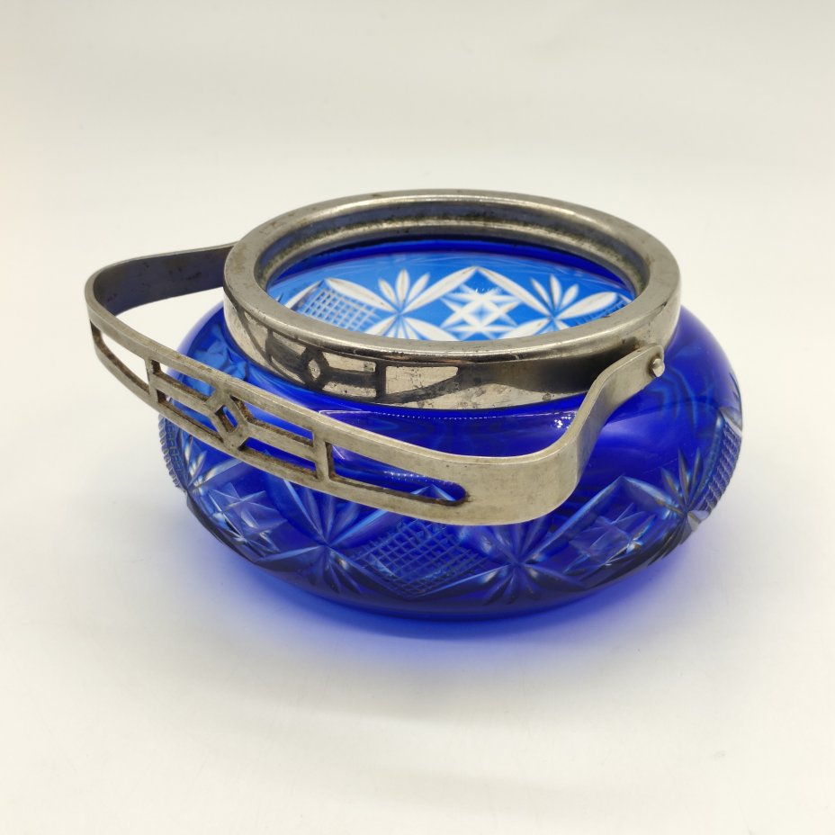 Сахарница из кобальтового стекла с резным декором и прорезной ручкой, металл, цветное стекло, алмазная грань, УПК «Автоштамп», Москва, СССР, 1960-1980 гг.