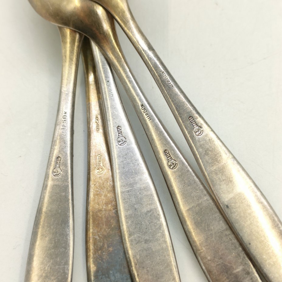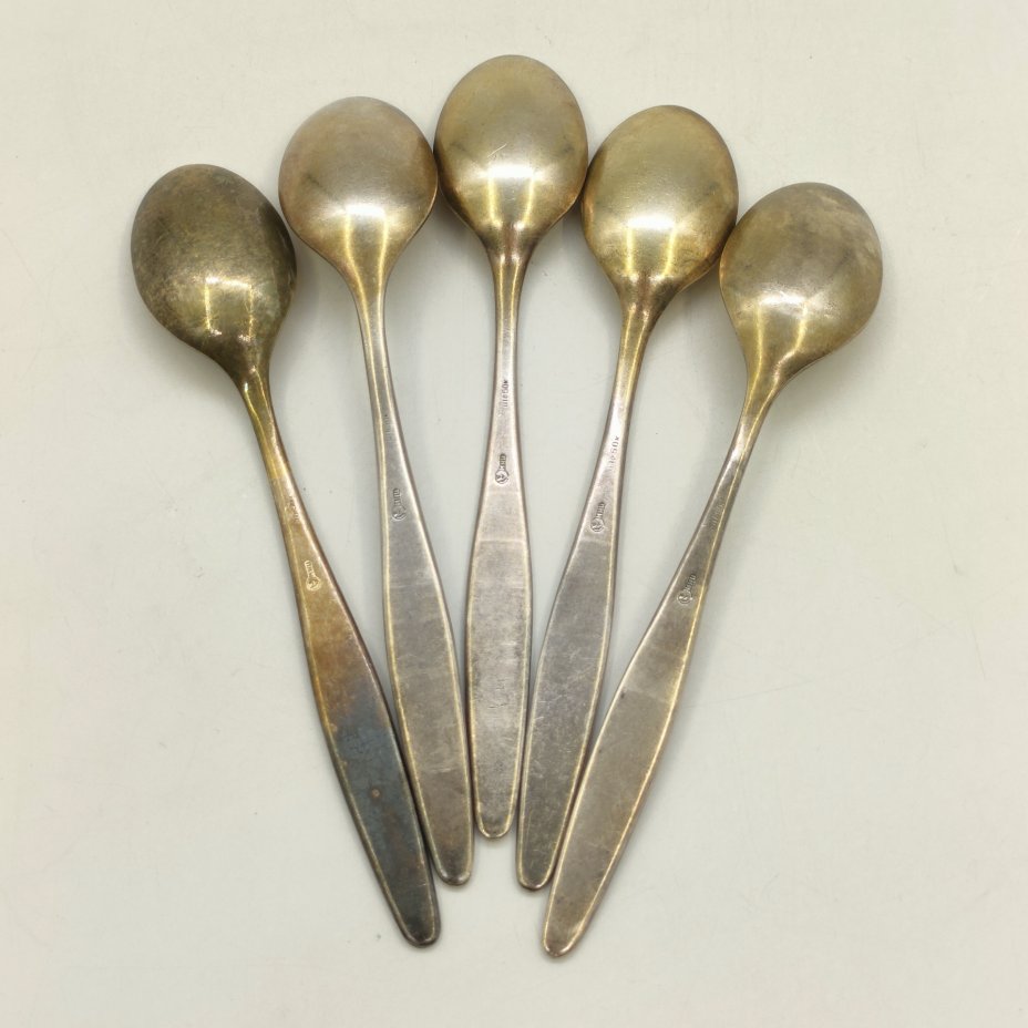 Набор чайных ложек на 5 персон, мНЦ (медь-никель-цинк), золочение, Кольчугинский завод цветных металлов, СССР, 1970-1990 гг.