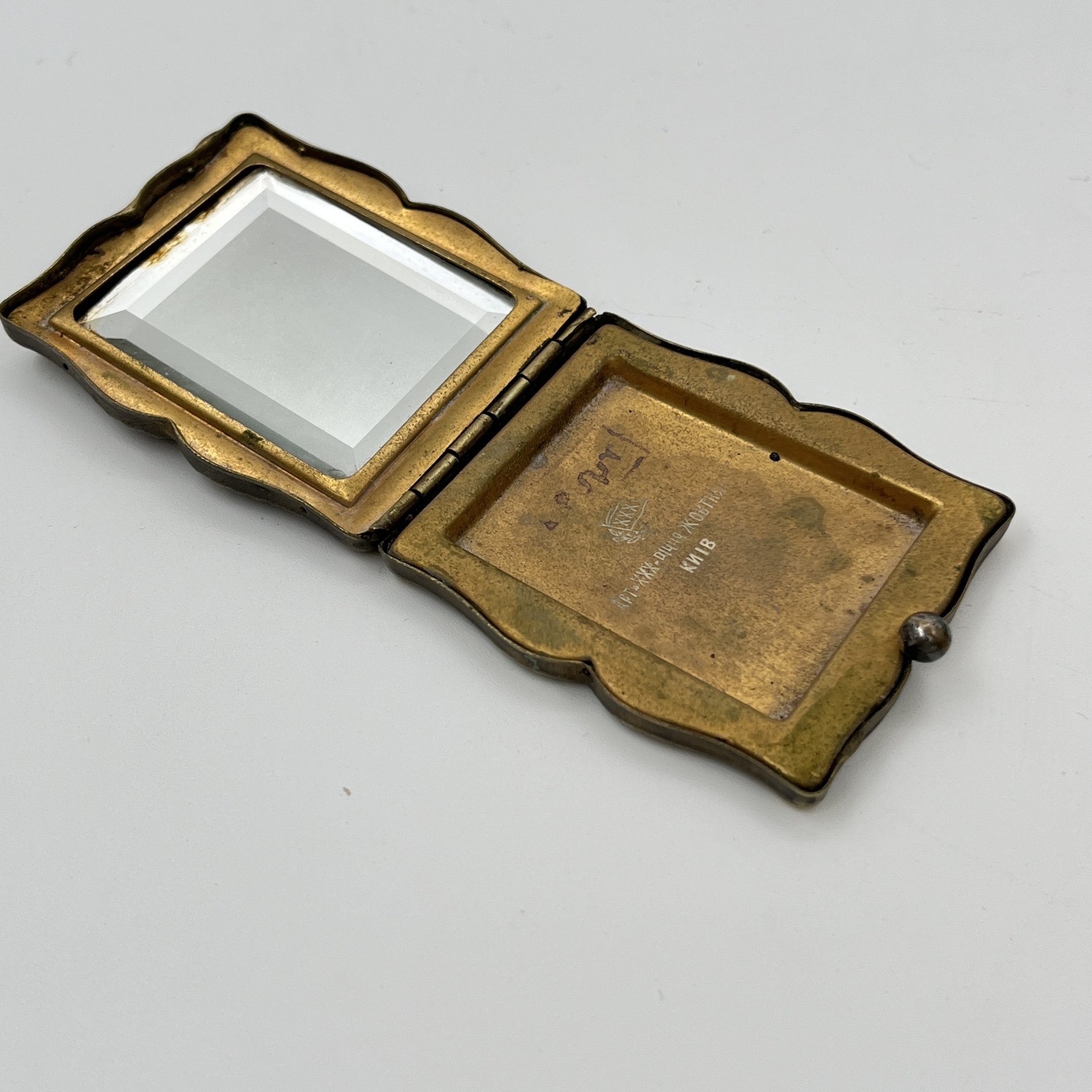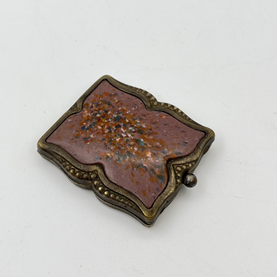 Пудреница с декоративной накладкой, латунь, пластмасса, стекло, СССР, 1960-1980 гг.