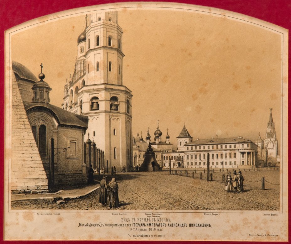 Литография "Вид на Кремль в Москве. Малый дворец, в котором родился государь Император Александр Николаевич 17 апреля 1818 года", автор Тимм В. Ф. Лист из журнала (№12, 1856) "Русский художественный листок В. Тимма", бумага, печать, стекло, рама, Российская империя, 1856 г.