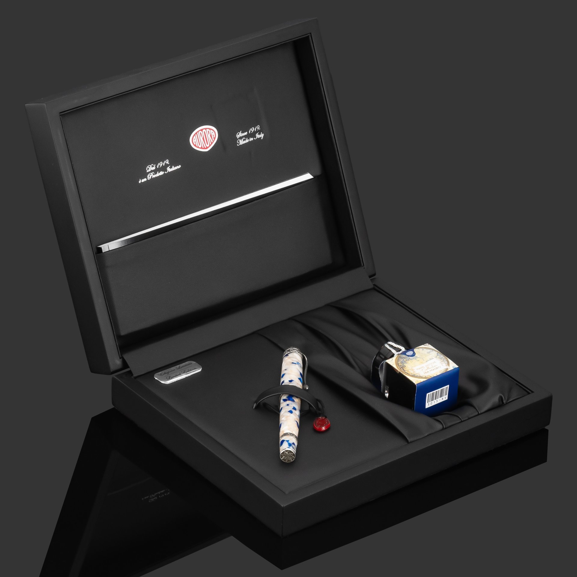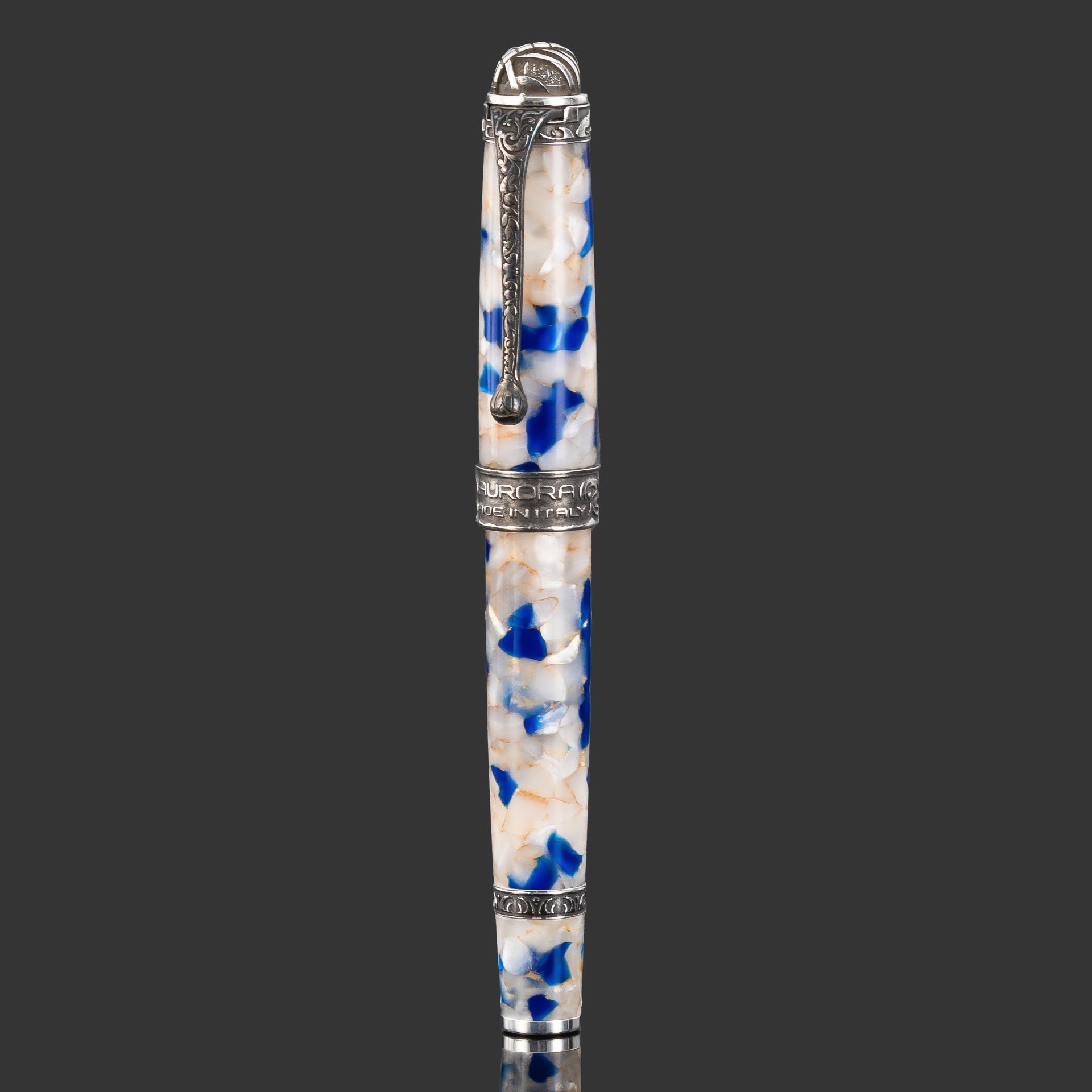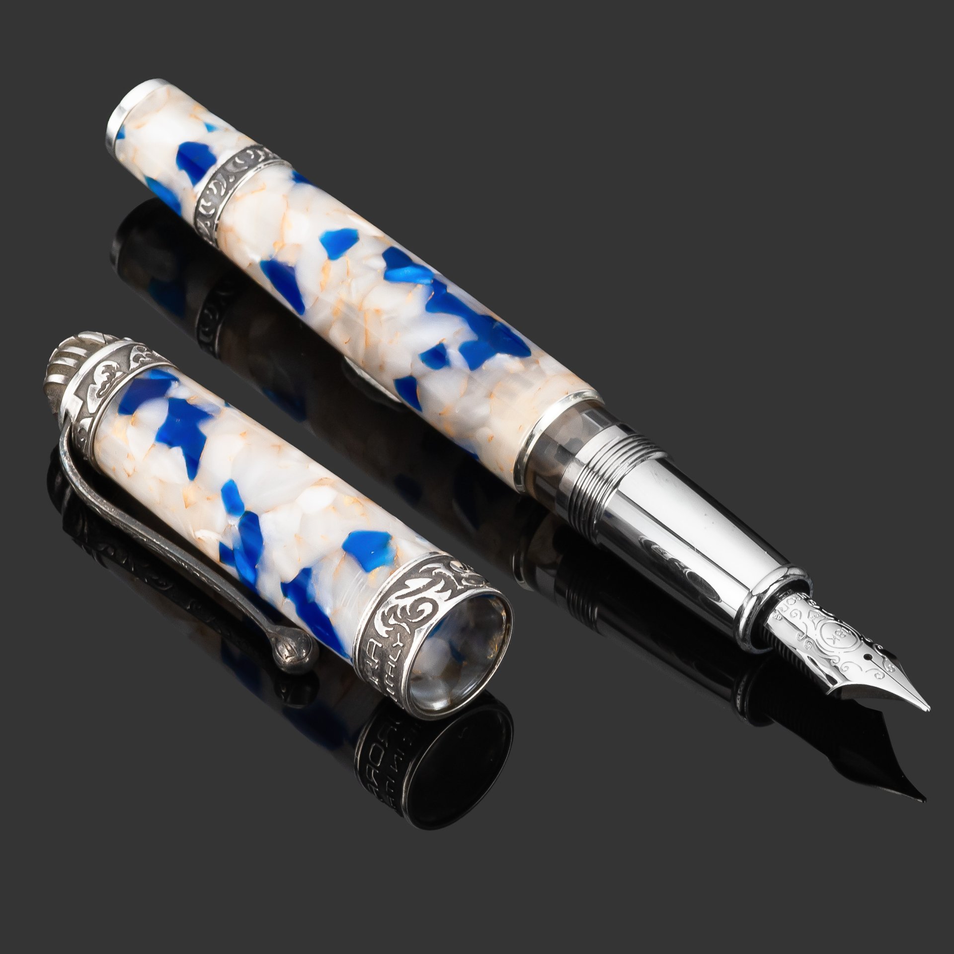 Перьевая ручка Fra Mauro имеет эффектный корпус из ауролоида с бежево-голубым мраморным узором, дополненный отделкой из стерлингового серебра (925‰). Она оснащена пером из цельного золота 750-й пробы, покрытым родием для долговечности и элегантности. Особую изюминку ручке придают армиллярная сфера на колпачке и роза ветров у основания, выполненные из цельного серебра 925‰. Это эксклюзивное издание, выпущенное ограниченным тиражом в 680 экземпляров.